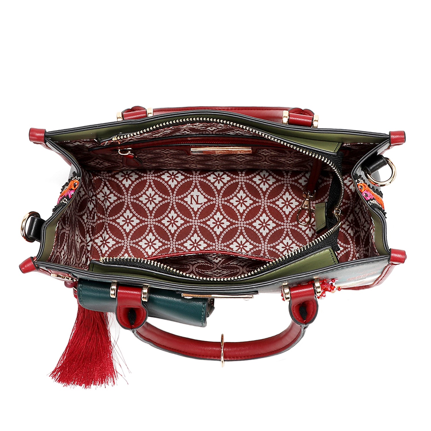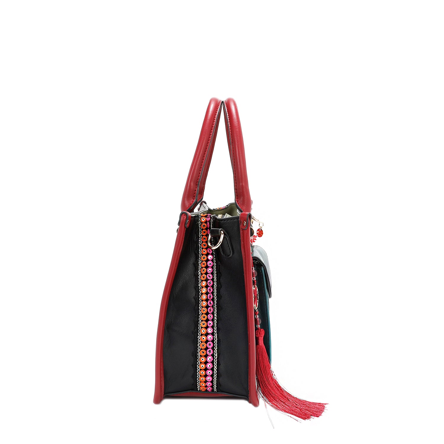 - Front keychain D-ring with detachable tassel charm