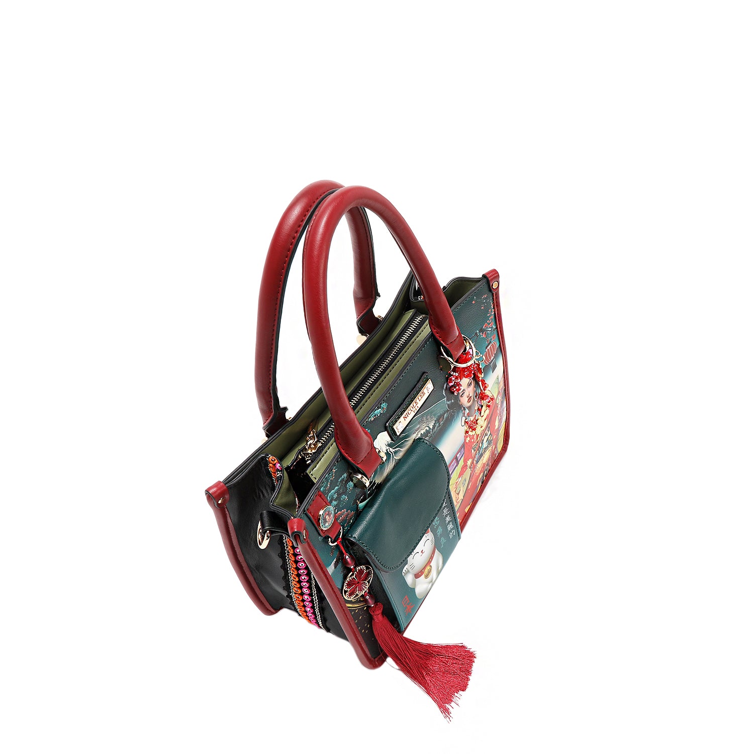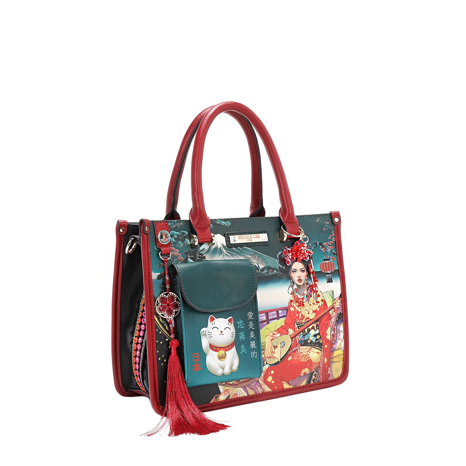 A structured work of art designed to bring you luck and lots of style, the Akiko La Belleza handbag blends cultural heritage and modern sophistication with shining beads, a playful tassel charm, and a front flap pocket showcasing the iconic lucky cat, Maneki-neko. Not only is it an adorable touch, but it’s also the perfect spot to stash cash for a bit of extra luck!