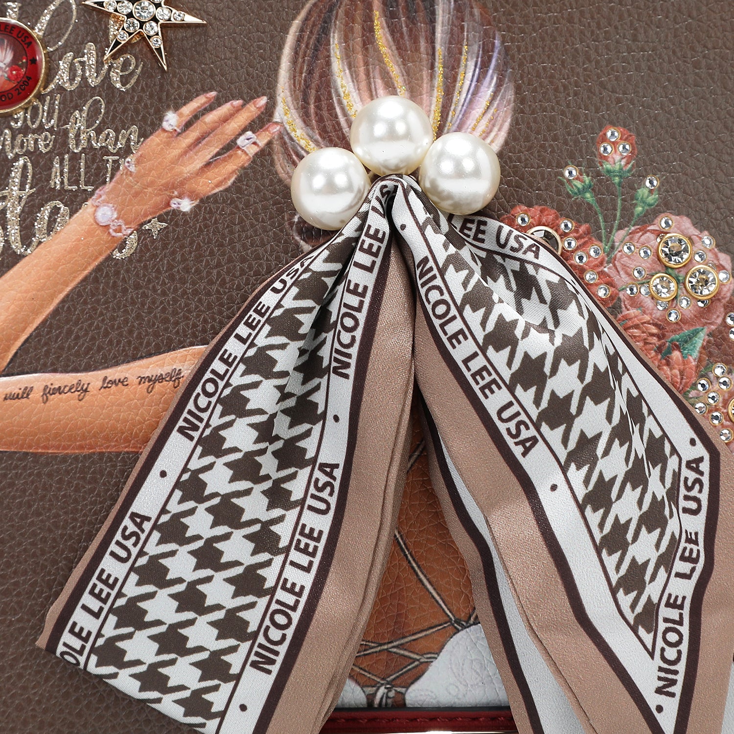 - Front is embellished with faux pearls, diamond rhinestones, and scarf detail