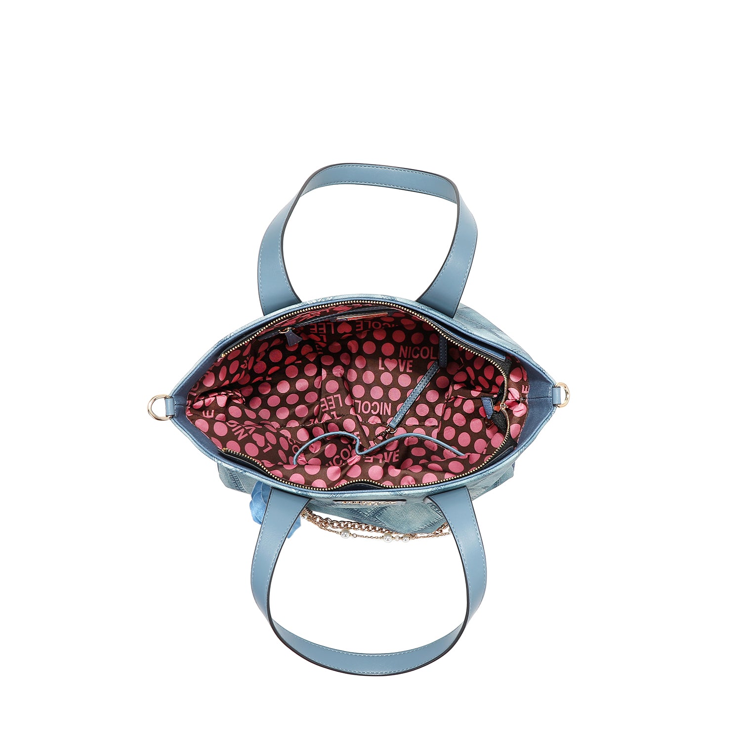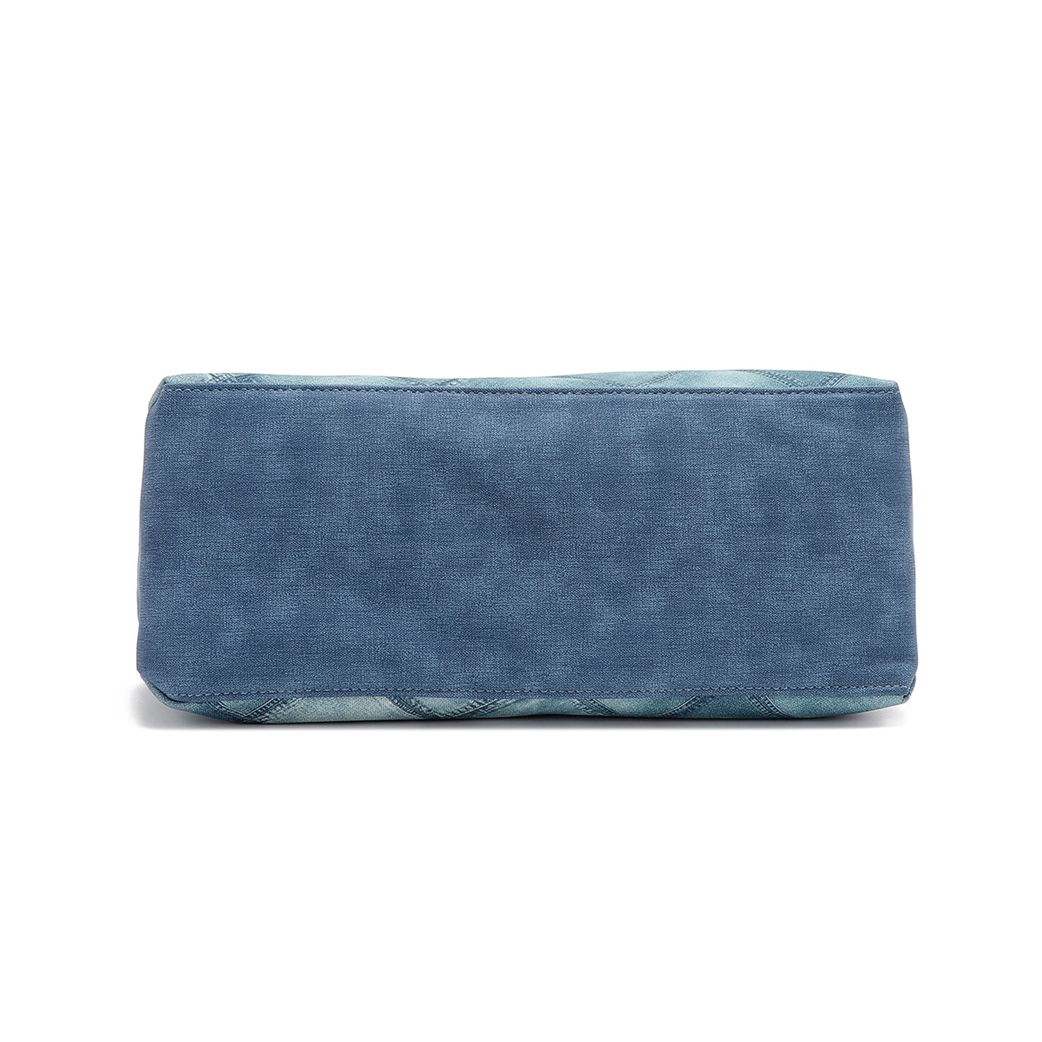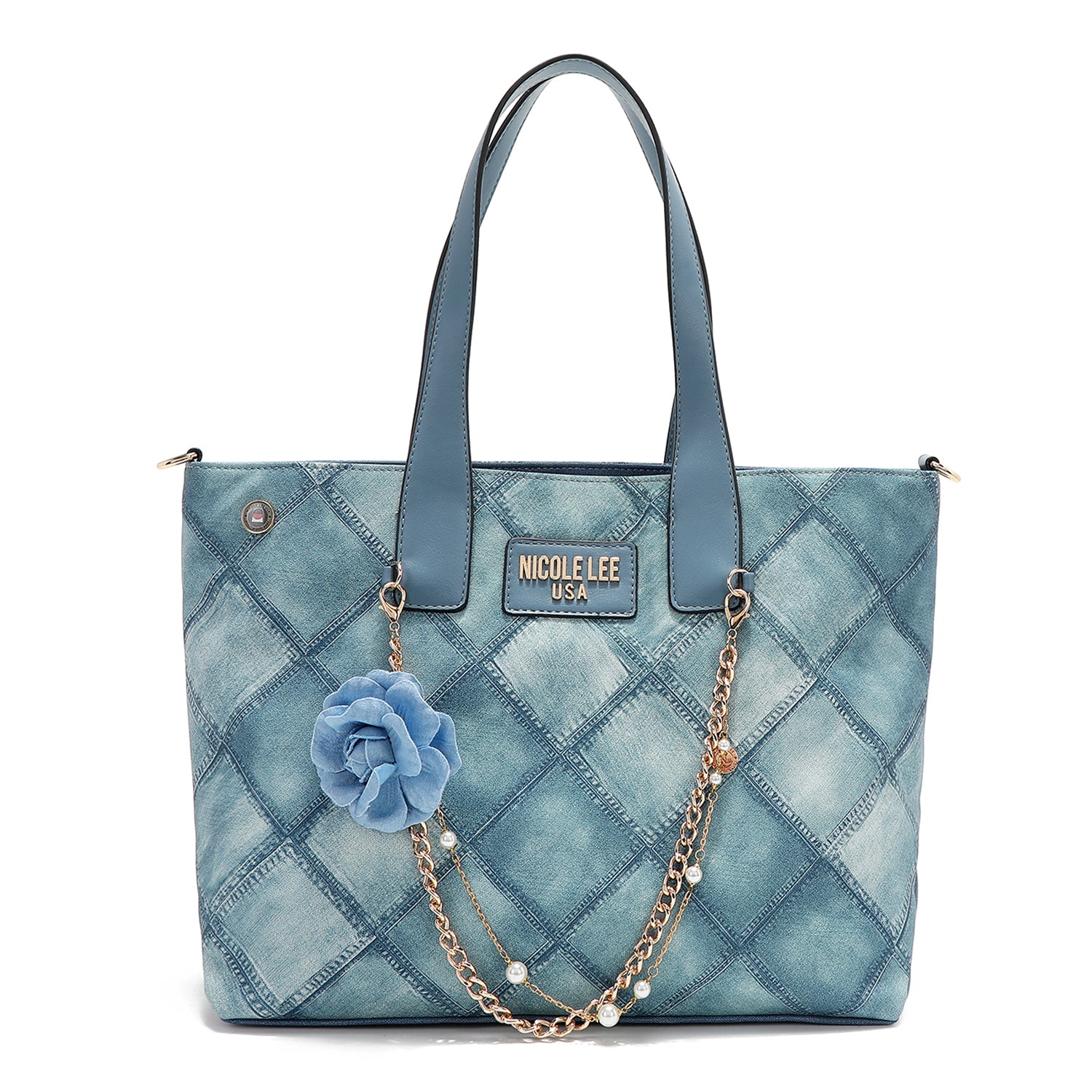 Meet your new favorite tote bag, perfect for work, the weekend, and everything in between. Crafted from vegan leather with a quilted patchwork pattern that mimics washed denim, this timeless beauty features a spacious interior for all your essentials. Add charm with the detachable pearl and gold chain-link strap, adorned with an elegant blue flower for the perfect finishing touch.