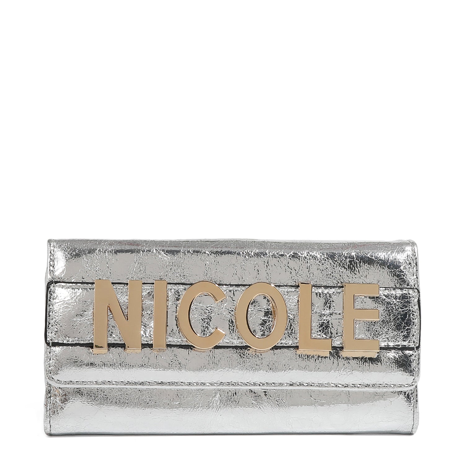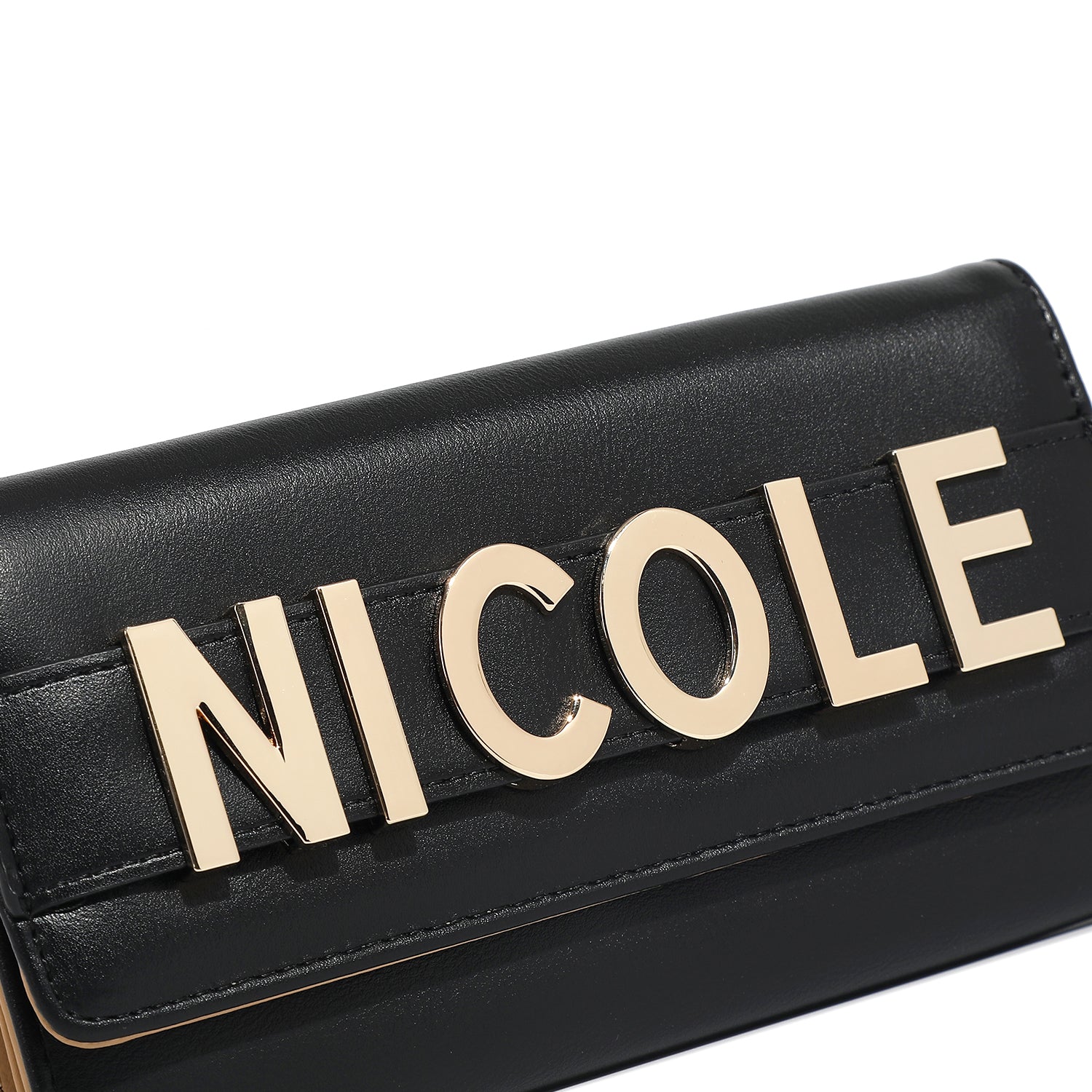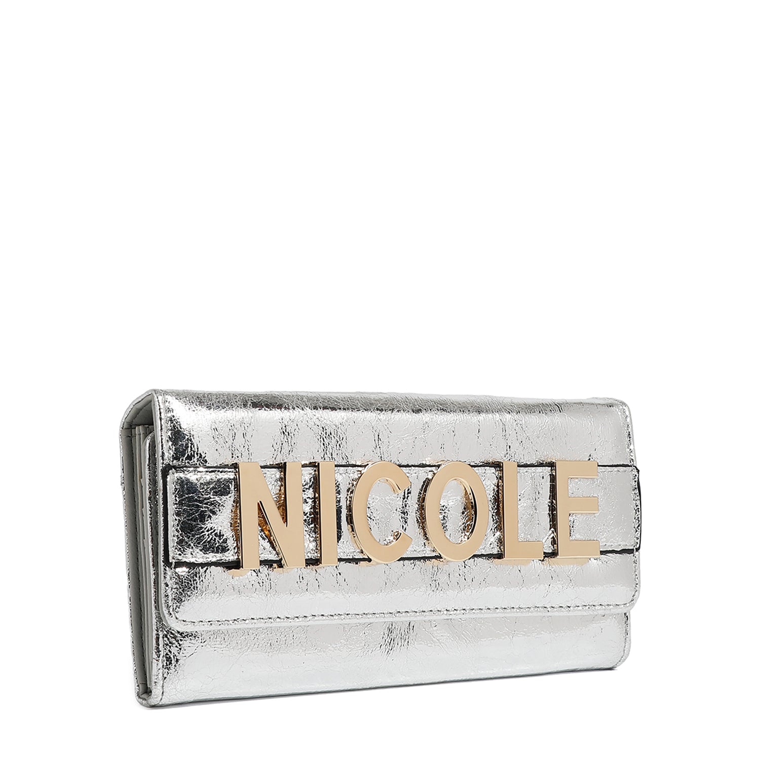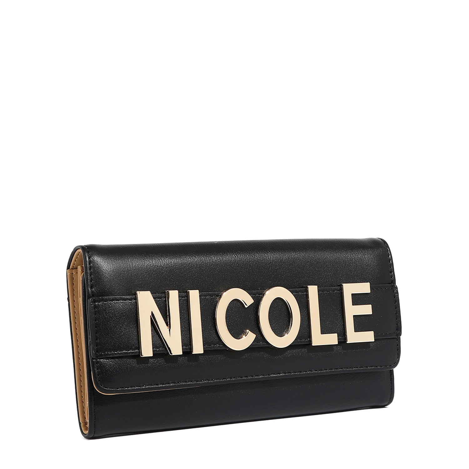 Elevate your essentials with our chic bifold flap wallet, featuring a bold NICOLE metal logo strap that doubles as a sleek clutch handle. With plenty of card slots and a zip compartment, it keeps everything organized in a timeless silhouette.