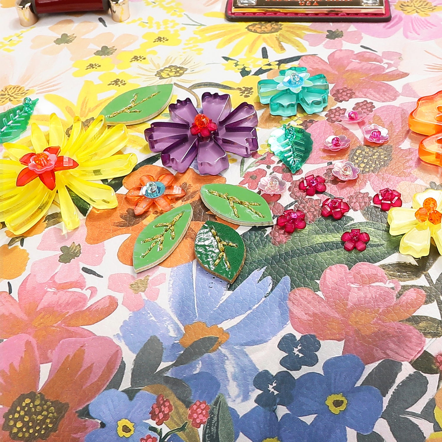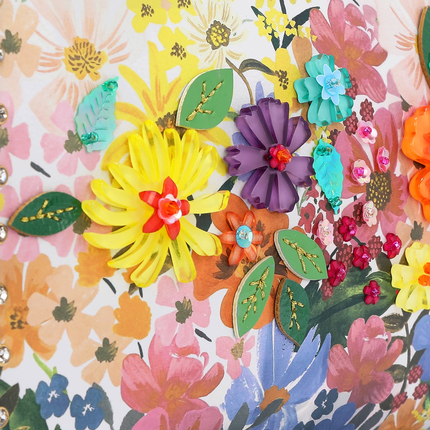 - Front is embellished with resin flowers, sequins, beads, and appliques