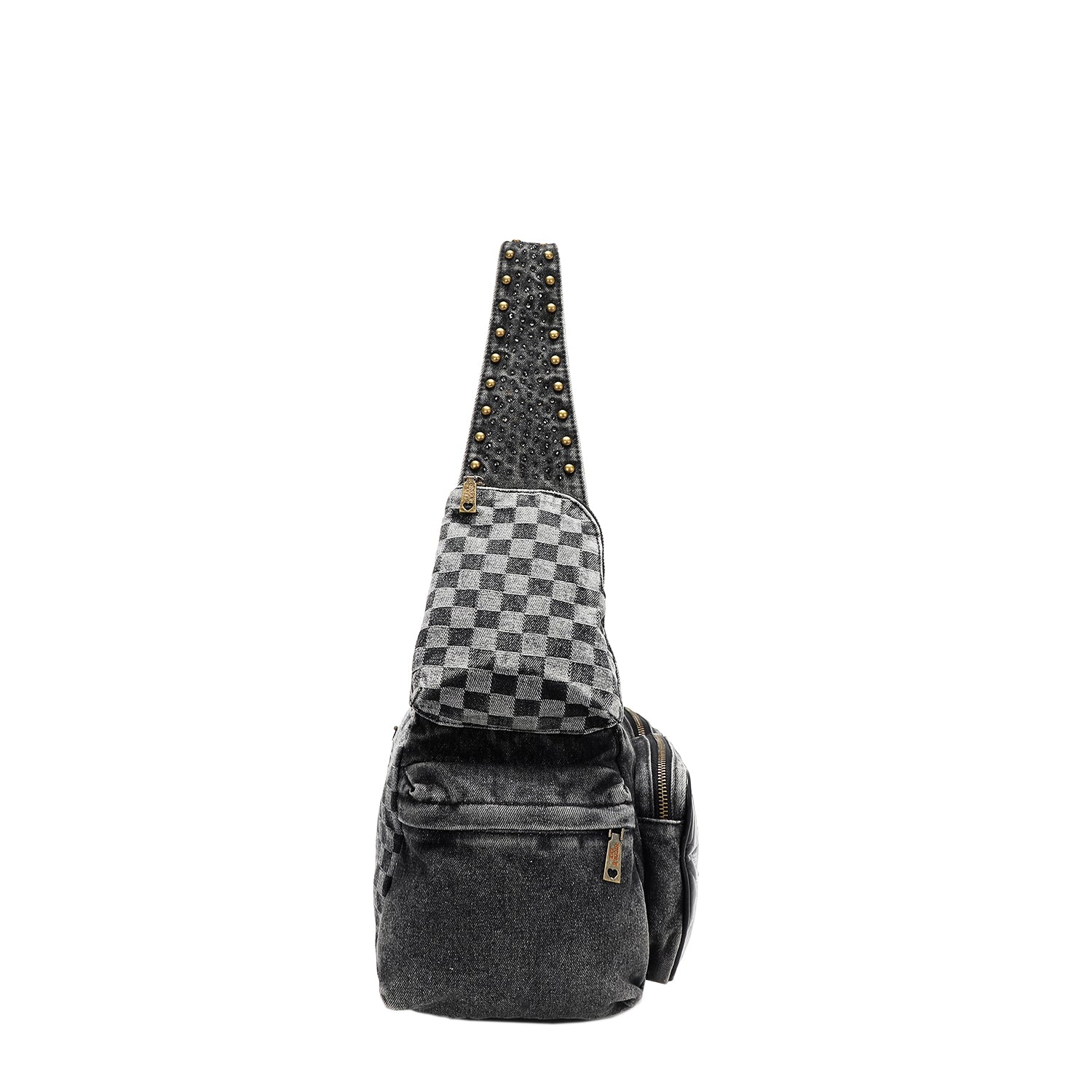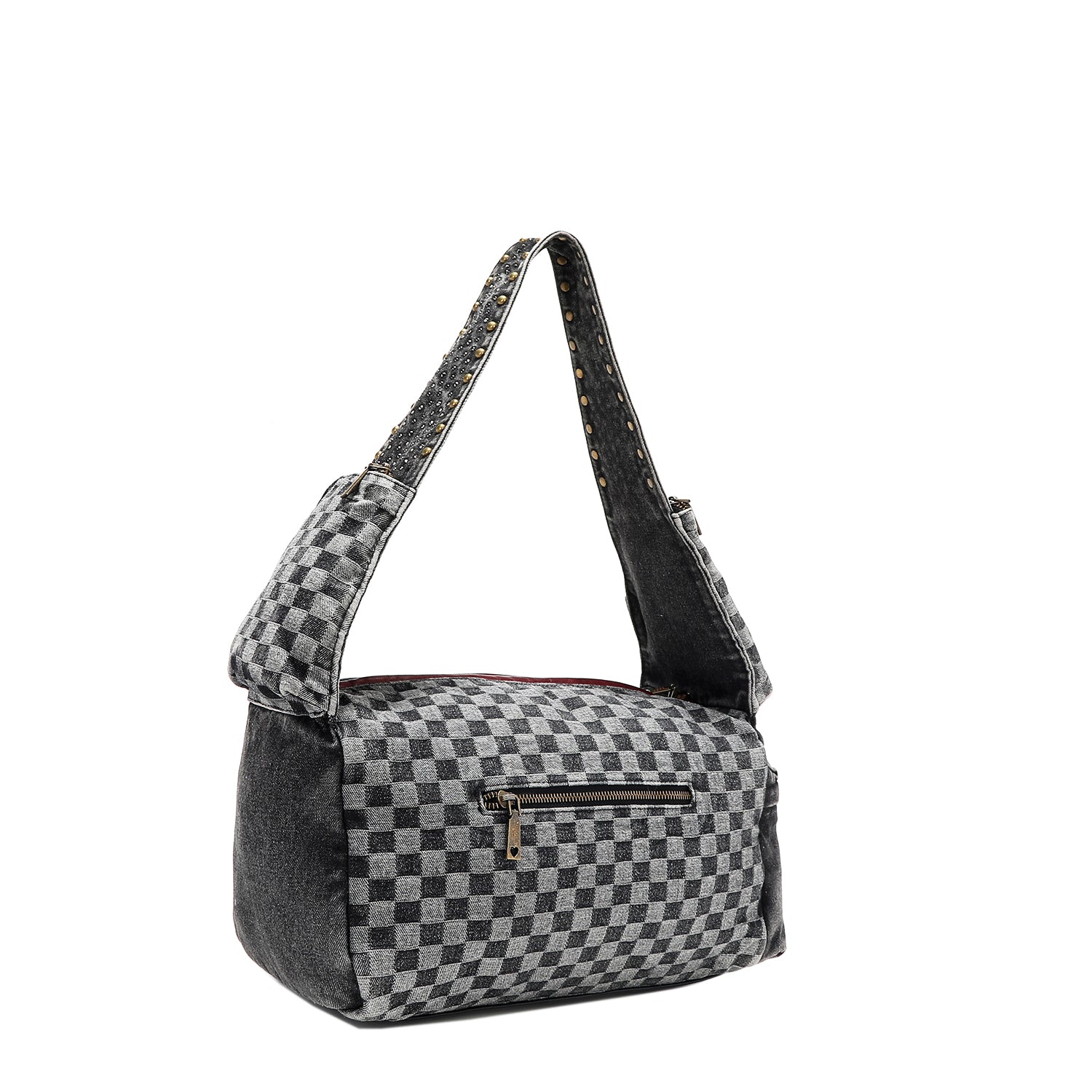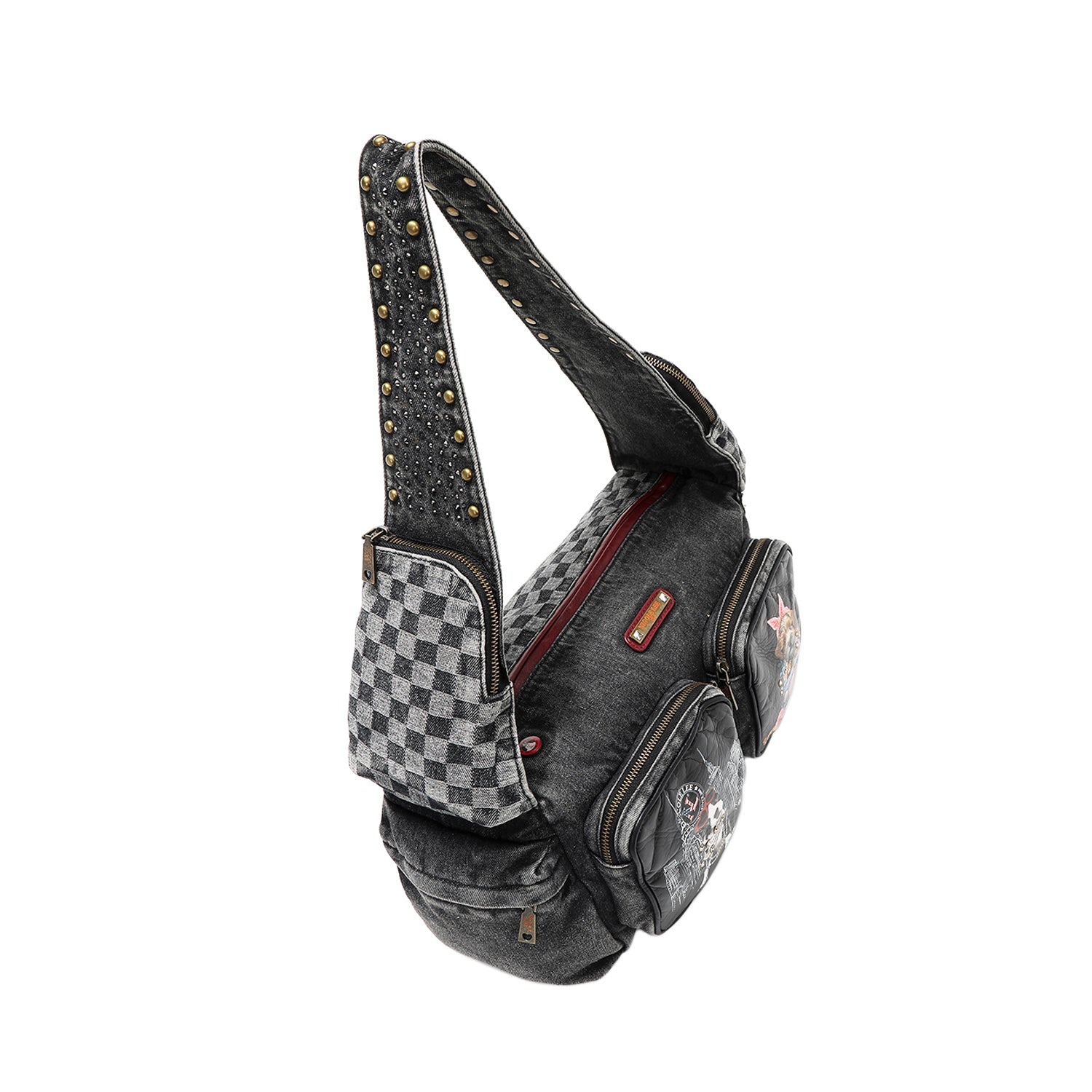 The Family Yearbook denim shoulder bag is spacious and stylish, featuring zip pockets on the beautifully embellished wide shoulder strap—studded with tonal rhinestones for a chic touch. Perfect for keeping essentials like earbuds, lipstick, and money close at hand!