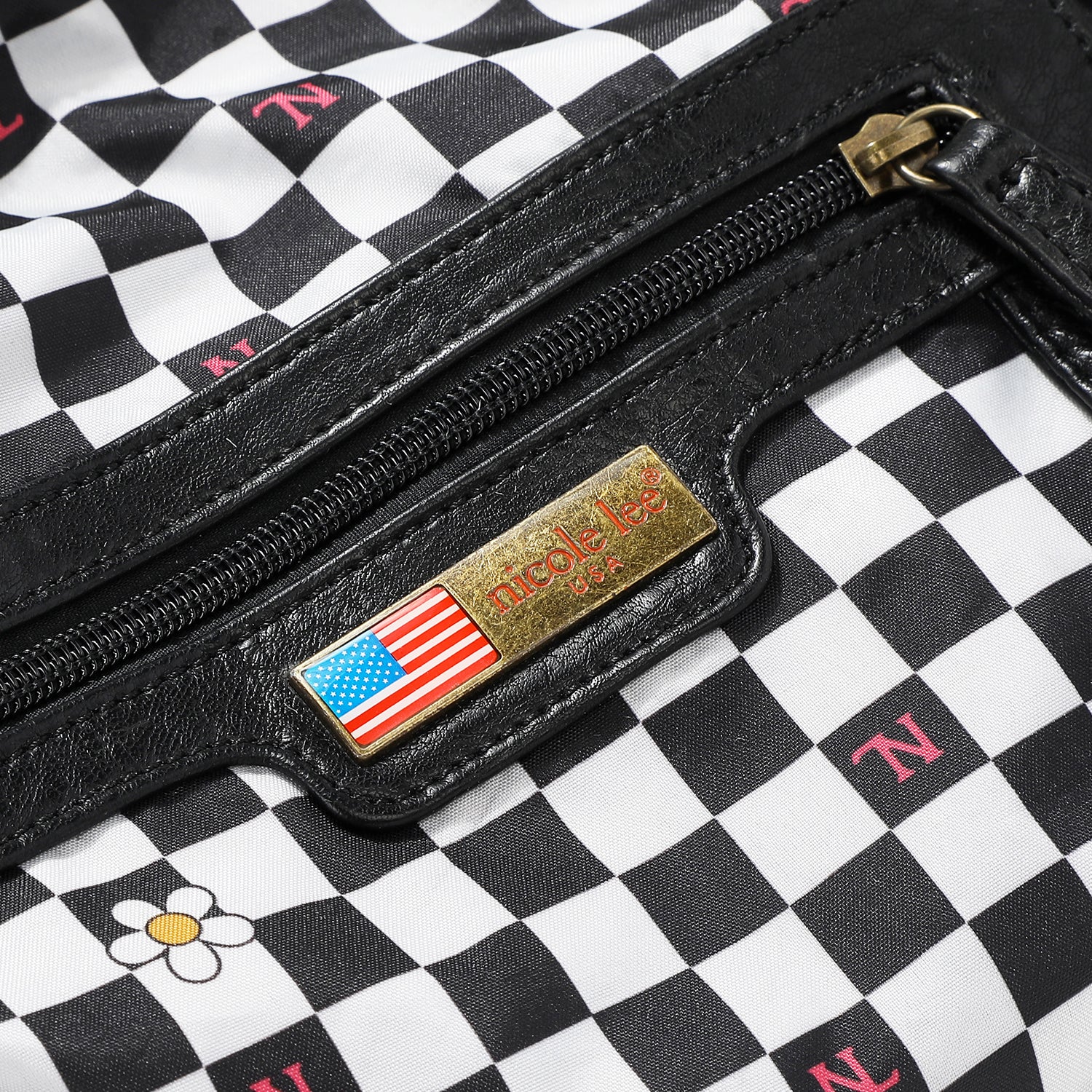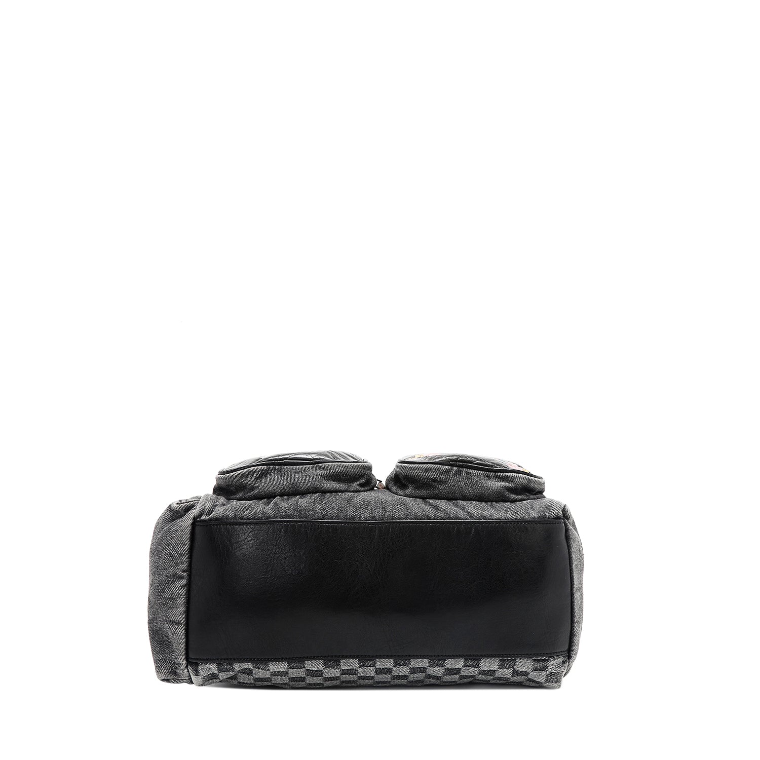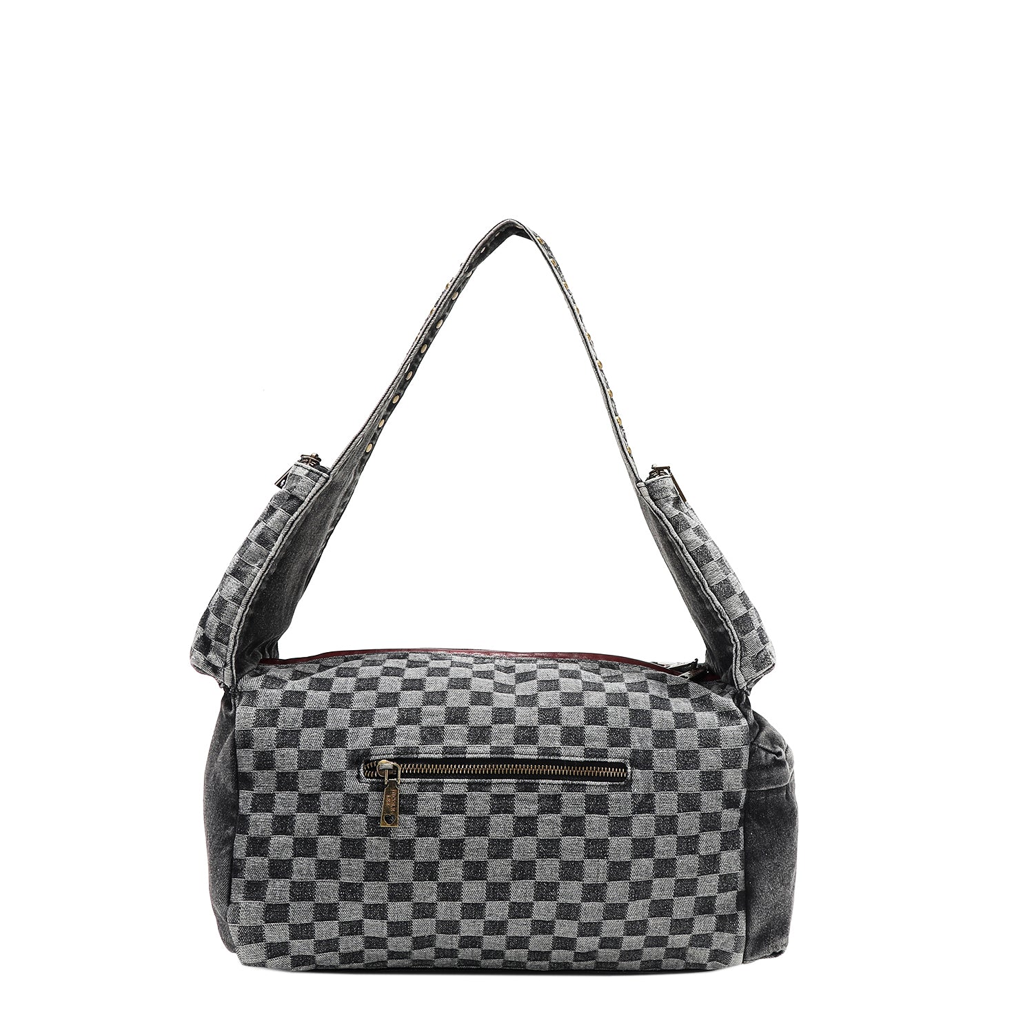 The Family Yearbook denim shoulder bag is spacious and stylish, featuring zip pockets on the beautifully embellished wide shoulder strap—studded with tonal rhinestones for a chic touch. Perfect for keeping essentials like earbuds, lipstick, and money close at hand!
