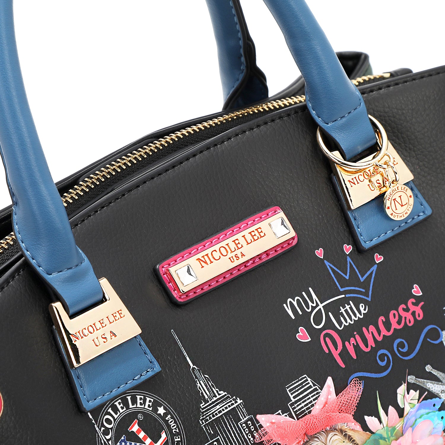 - Structured, rolled dual top handles (5' drop) with Nicole Lee authentic circle charm