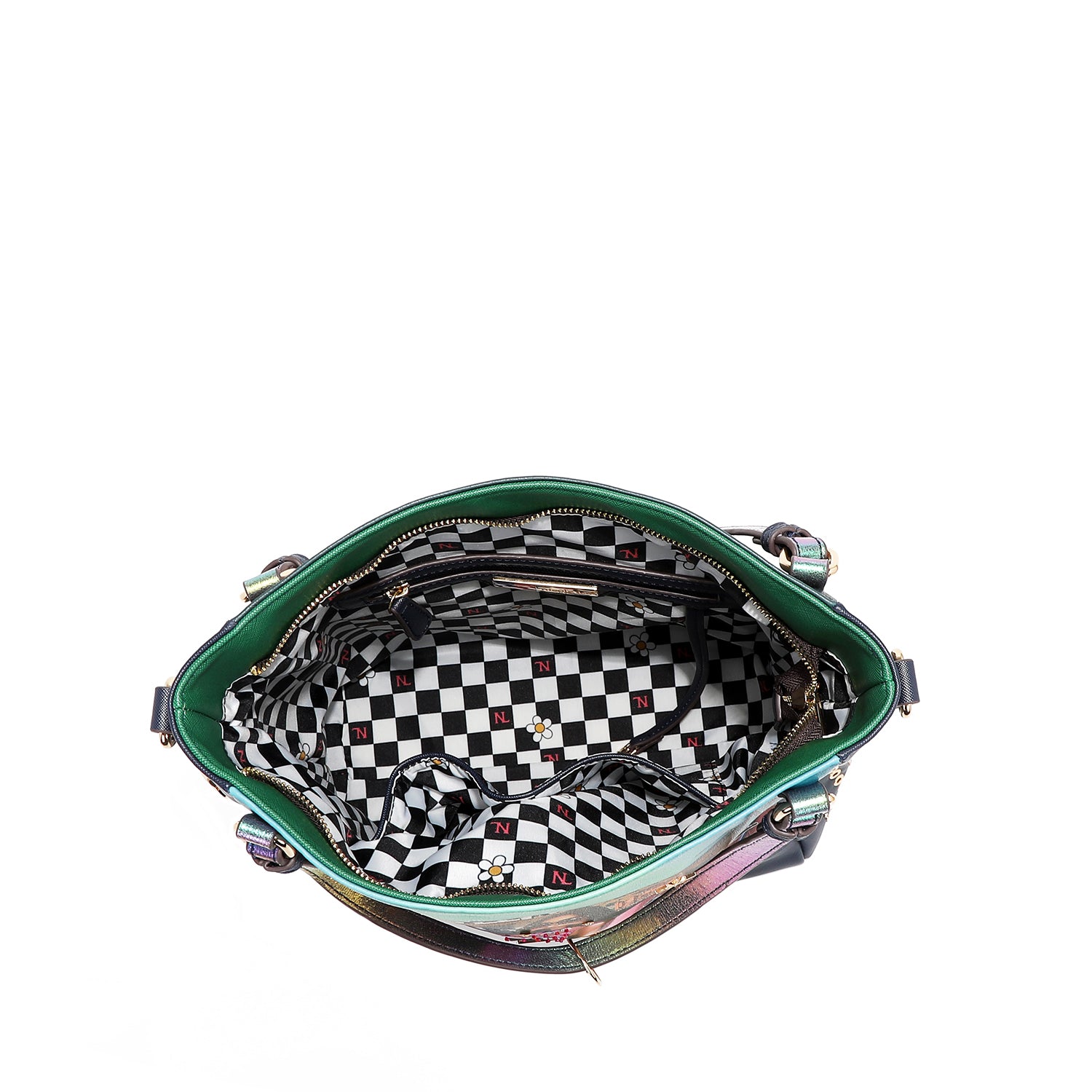 - Front design embellished with iridescent and multicolored sequins