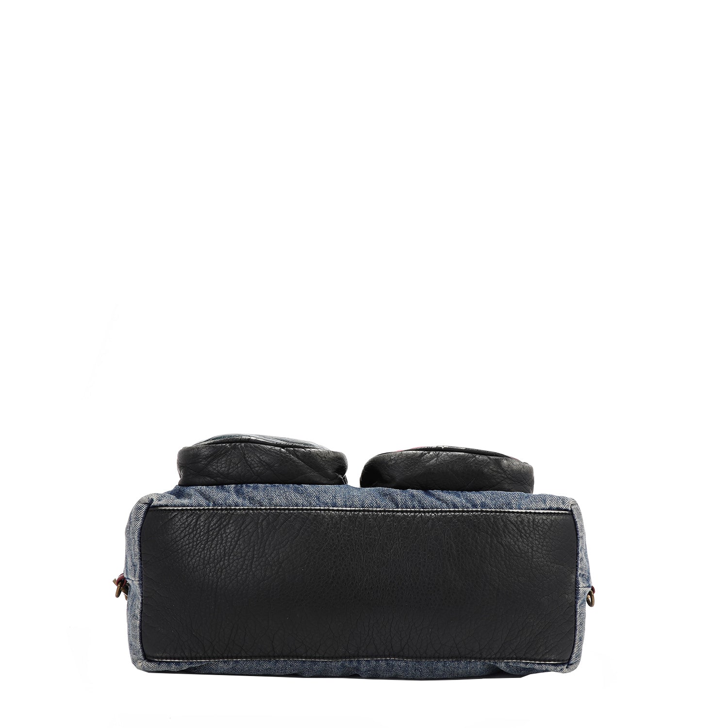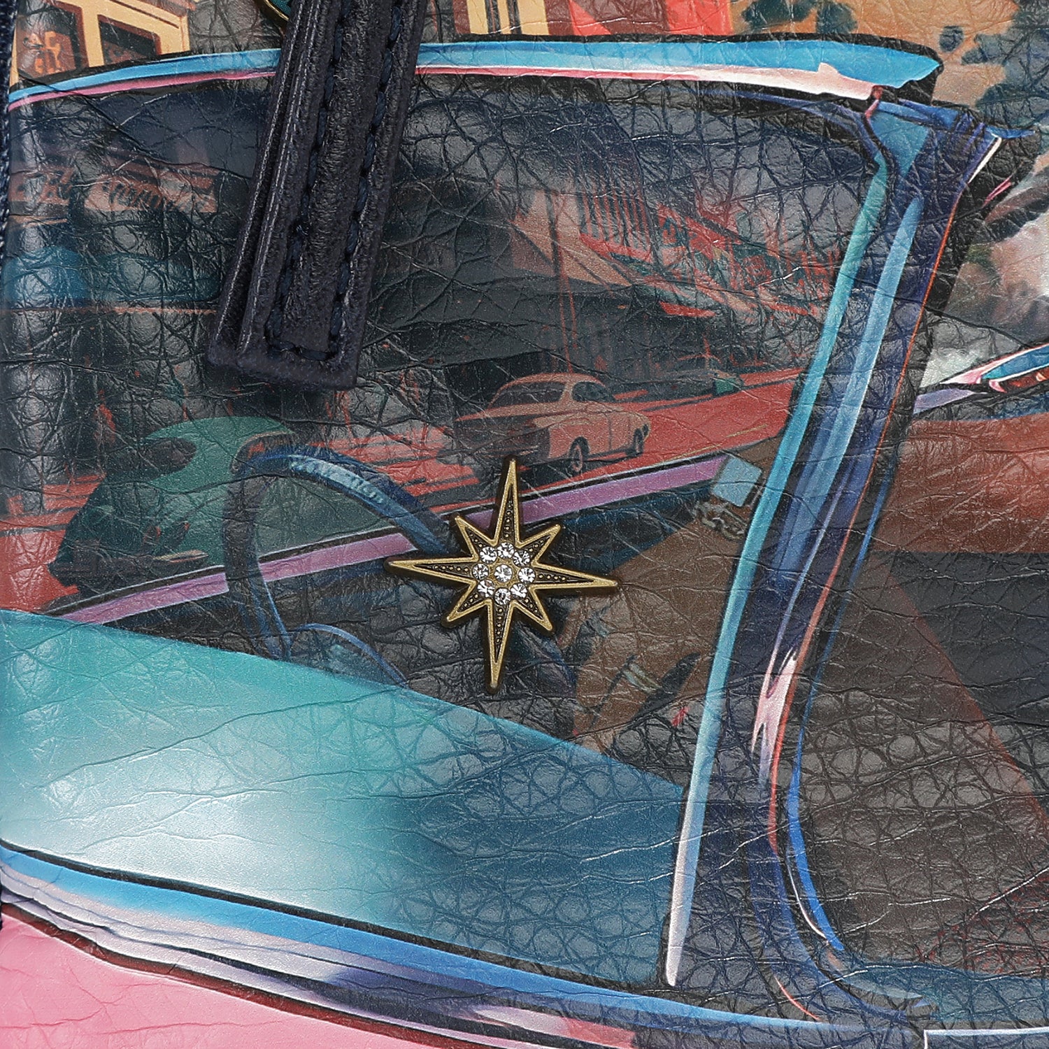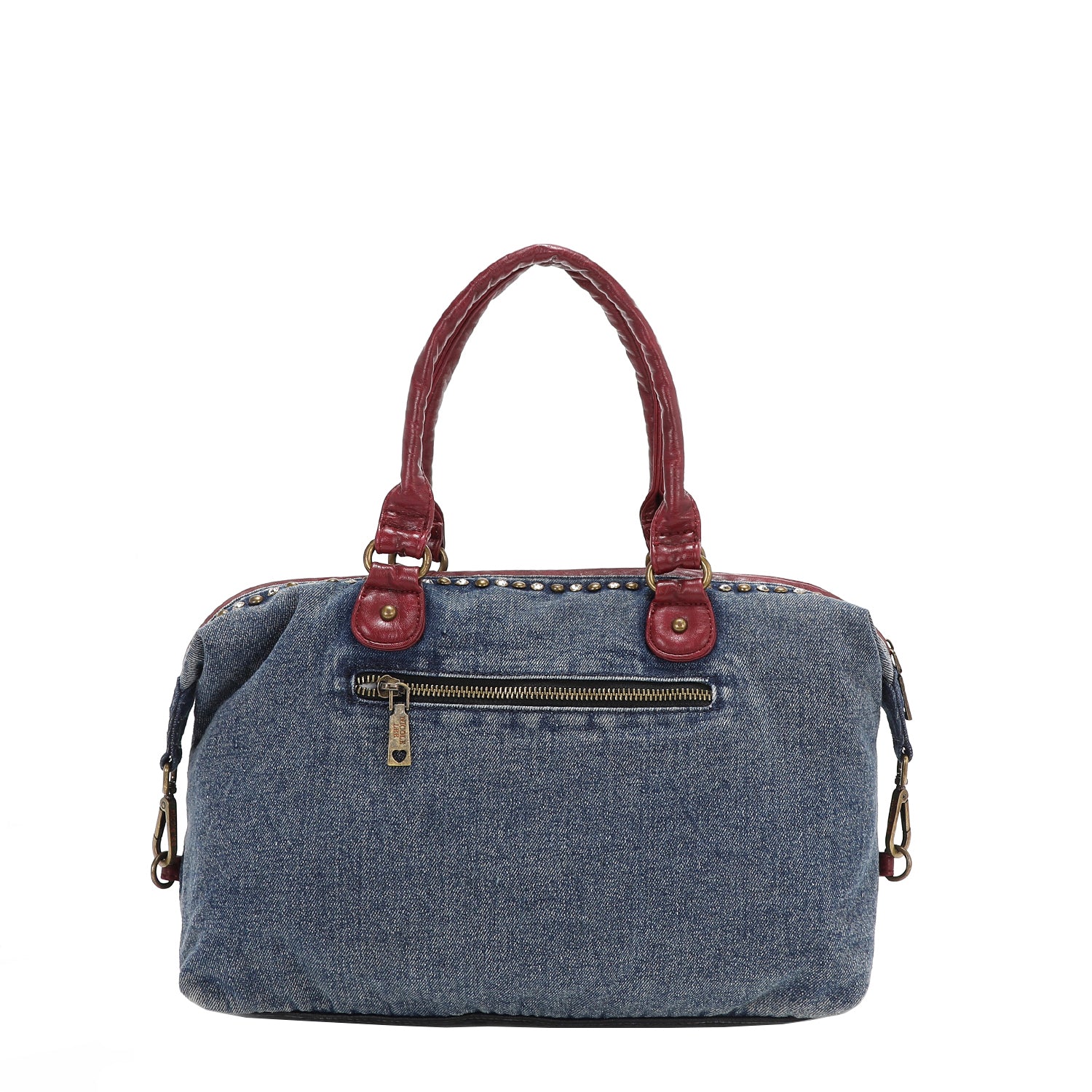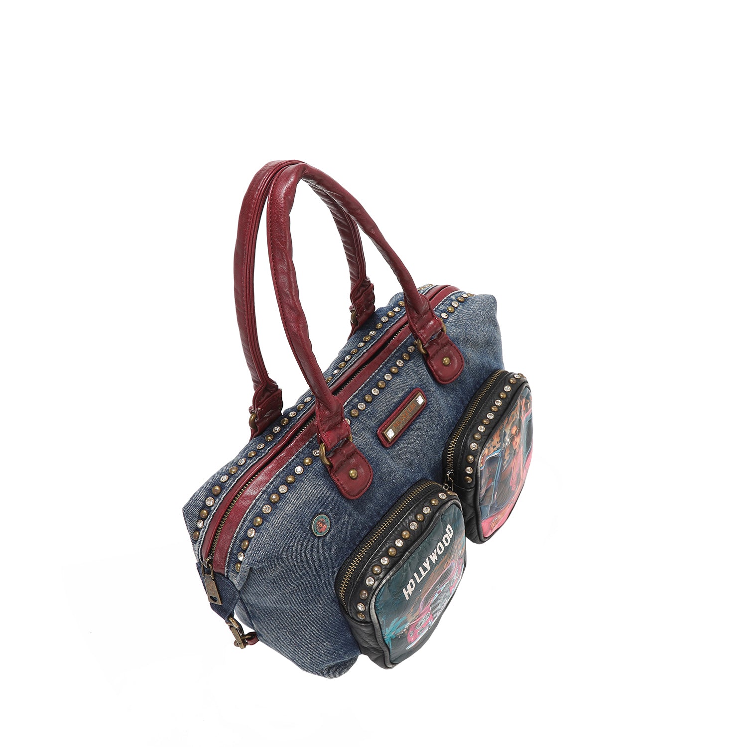 The perfect blend of bold and chic, our Hollywood Drive studded handbag is crafted from distressed washed denim with vegan leather accents and brass-tone hardware for a casual yet trendsetting look. The two front pockets add functionality and flair, making it a striking accessory for any wardrobe.