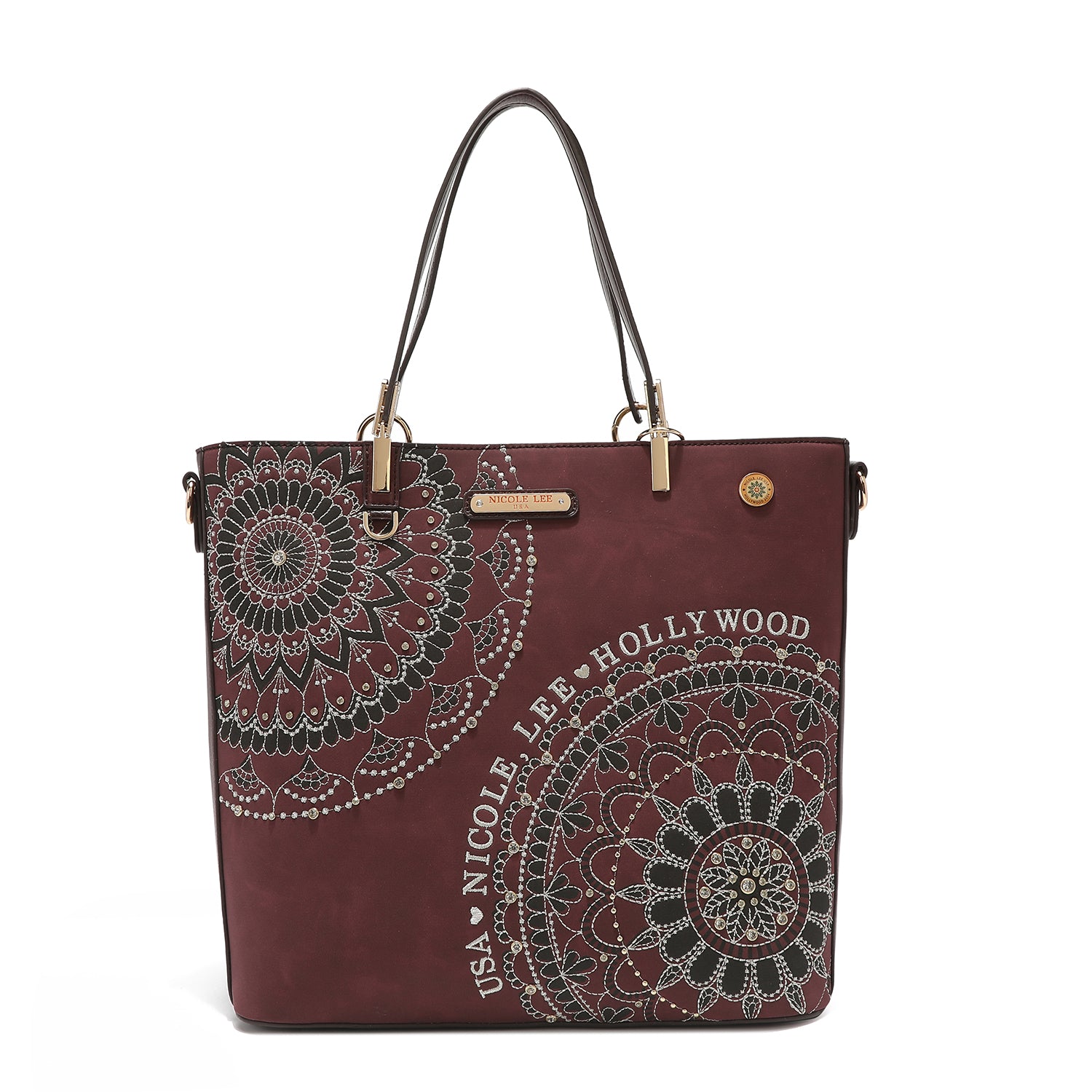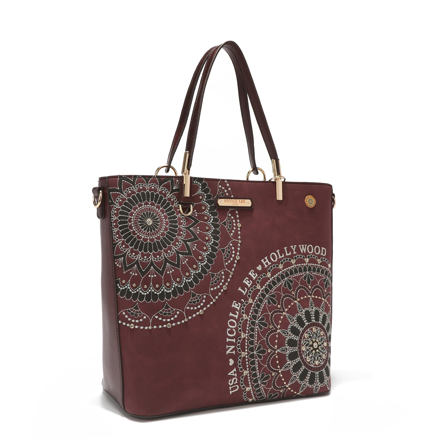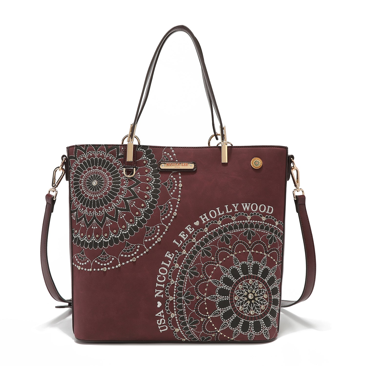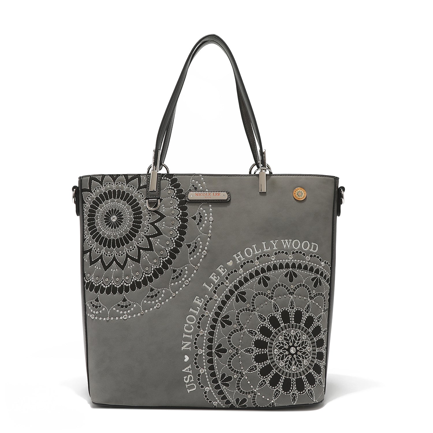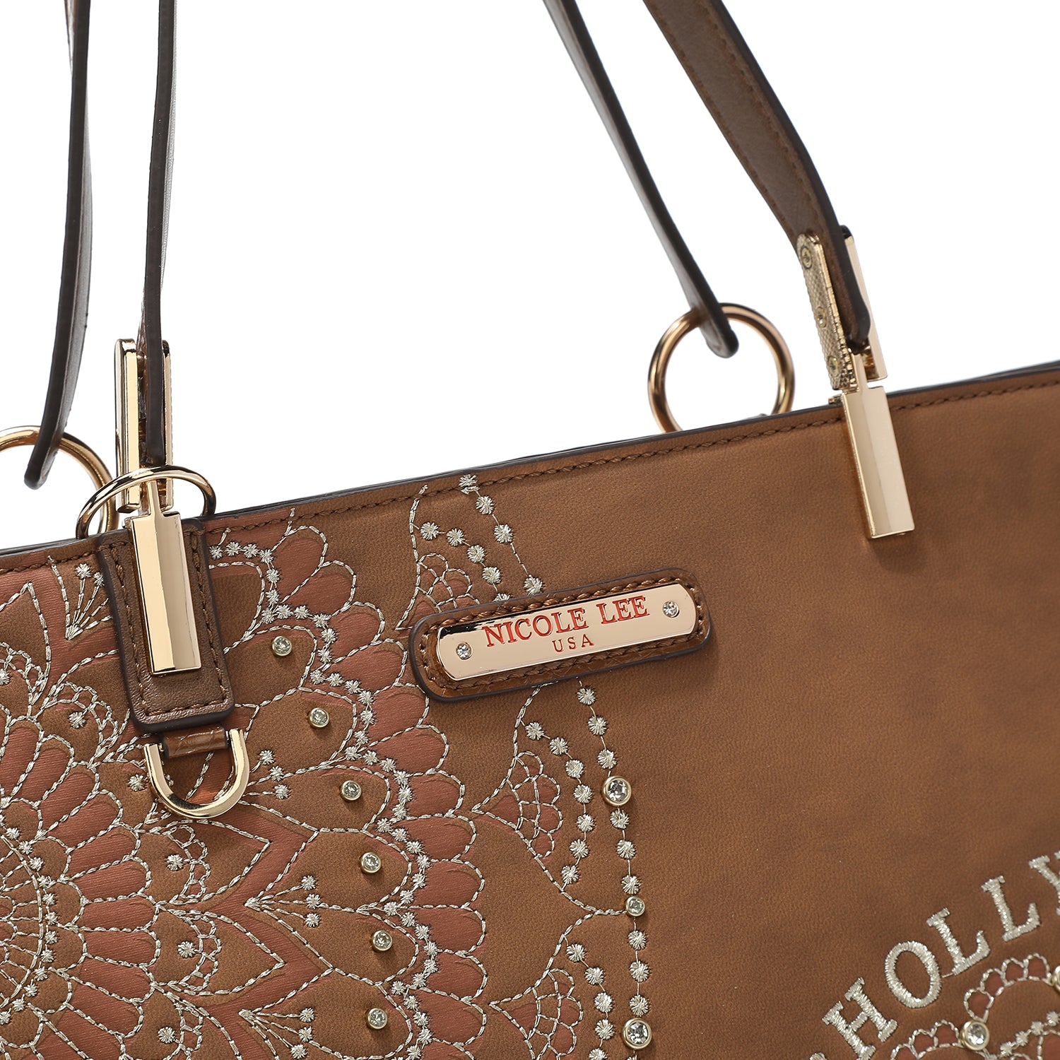 - Front design is embellished with diamond rhinestones and metallic stitching