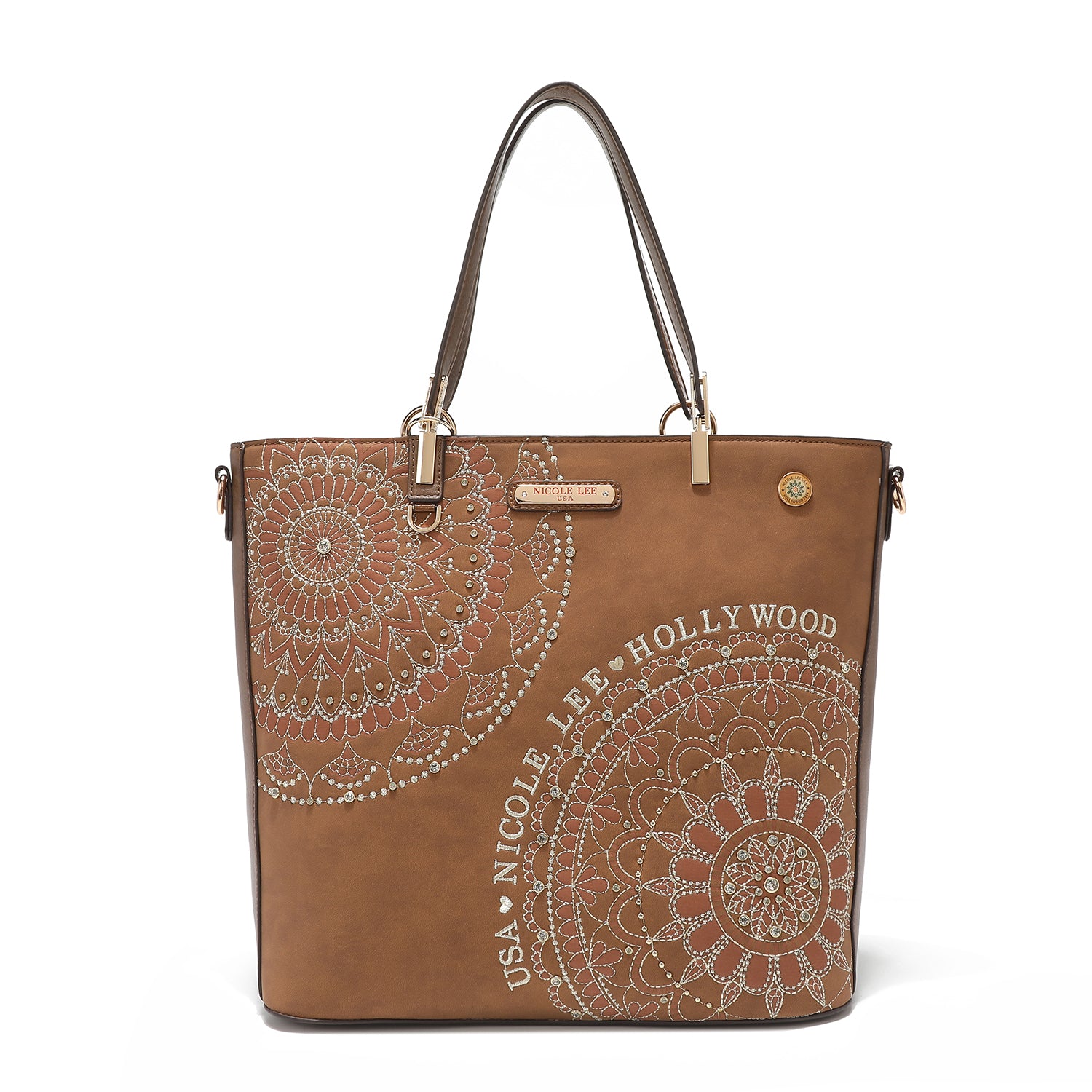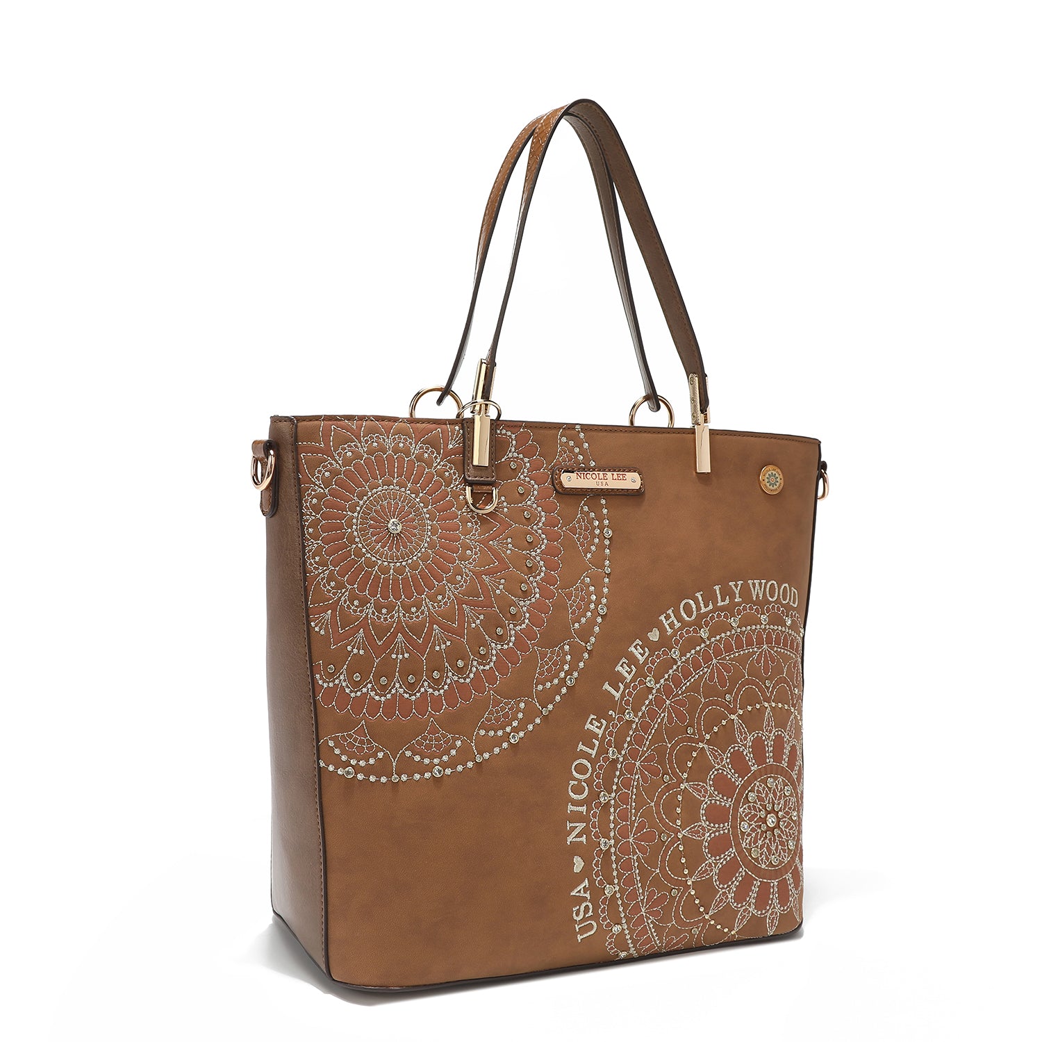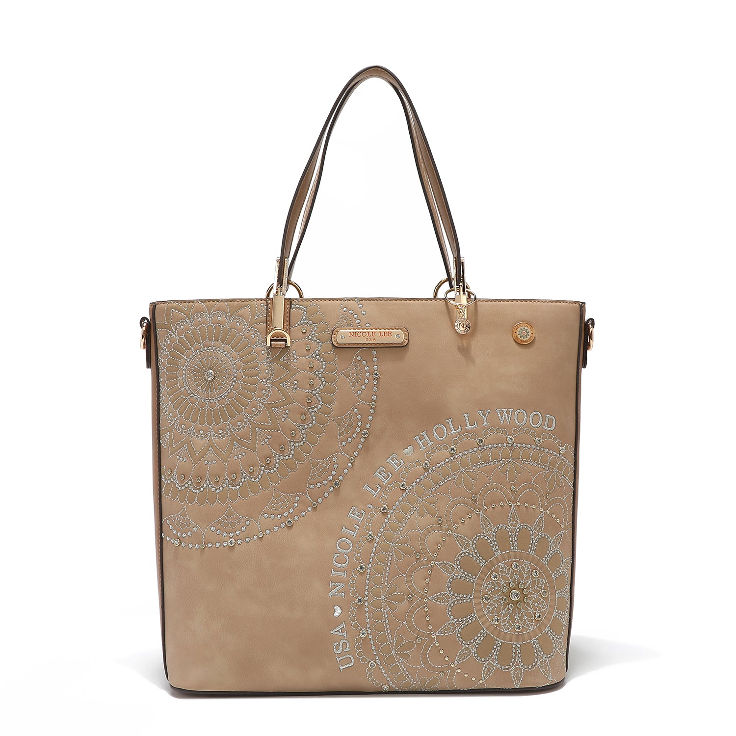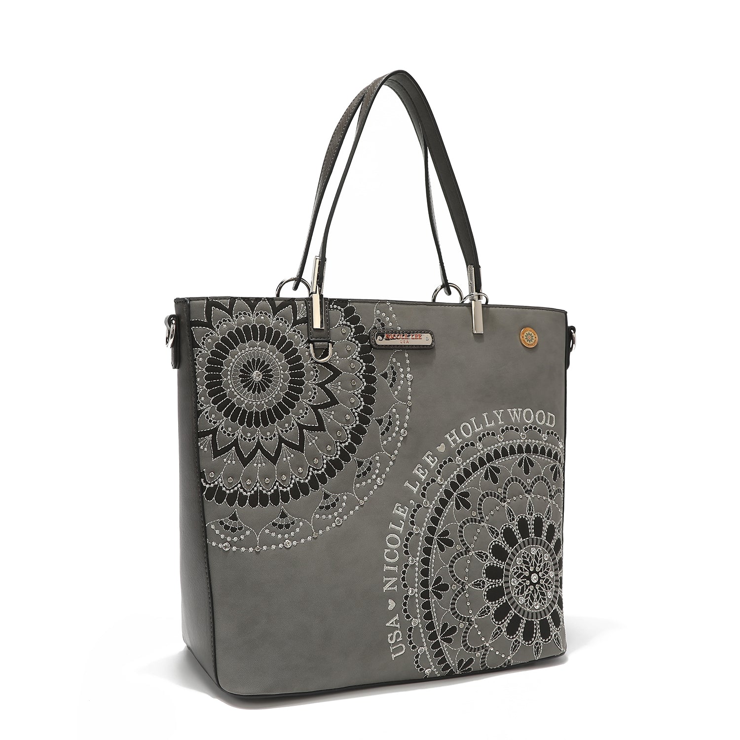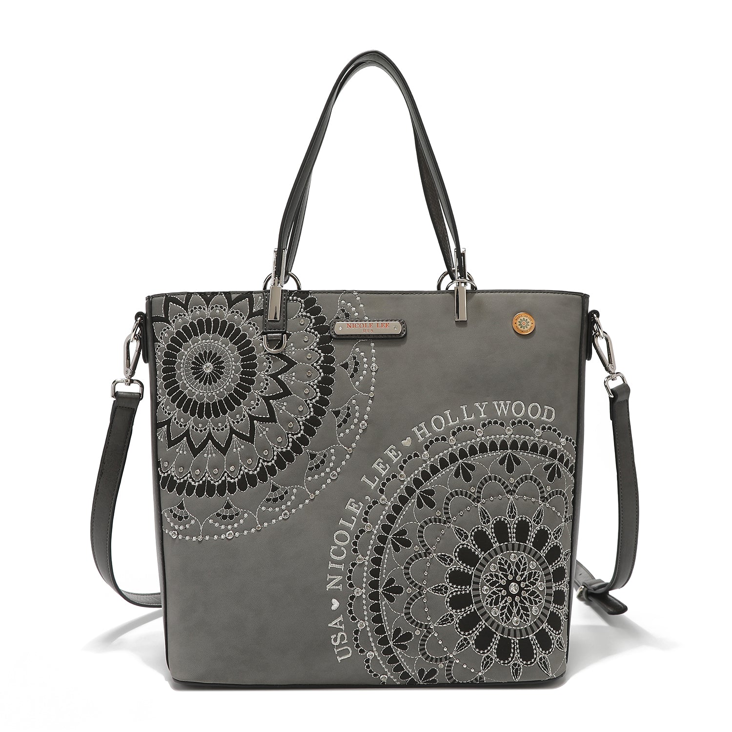 - Front design is embellished with diamond rhinestones and metallic stitching