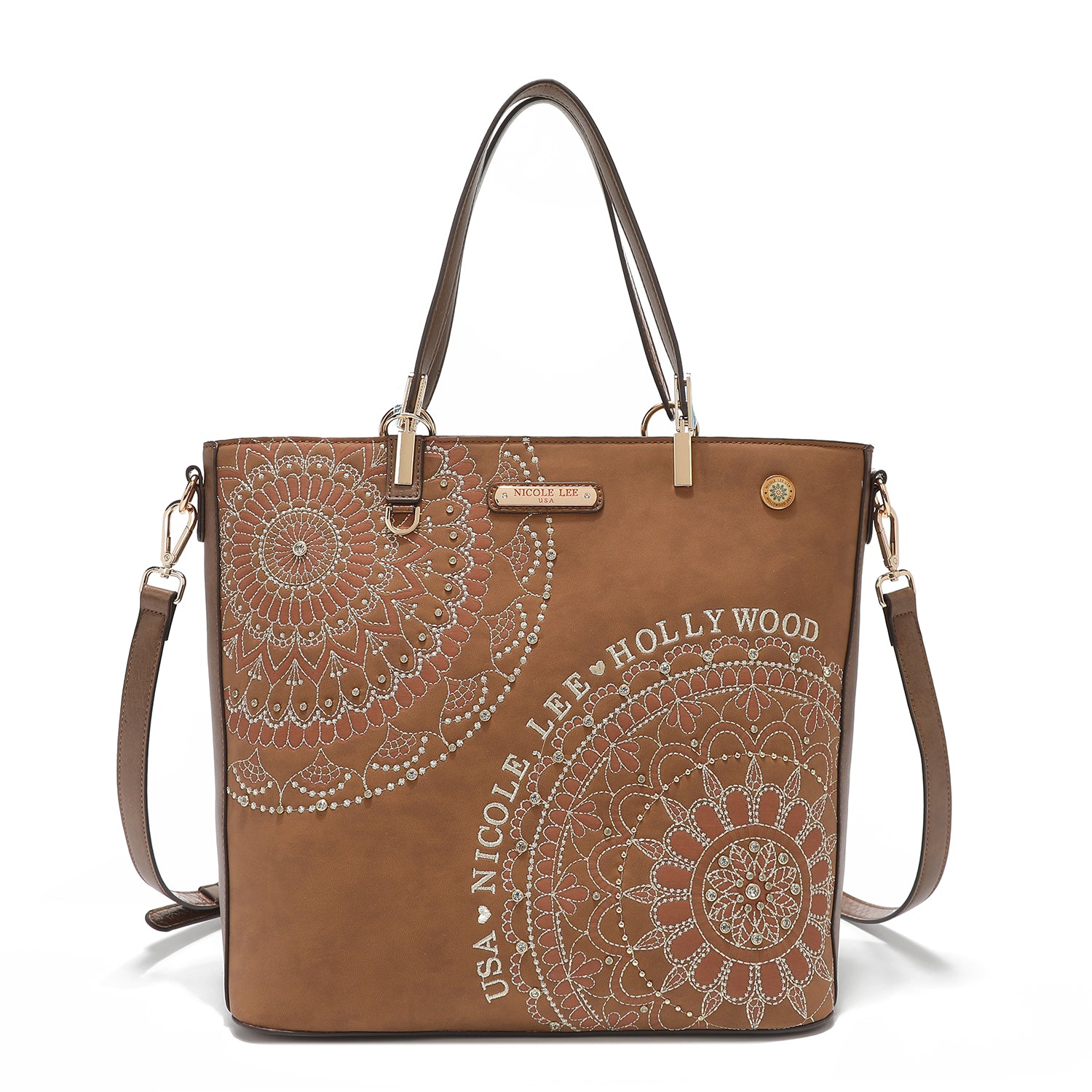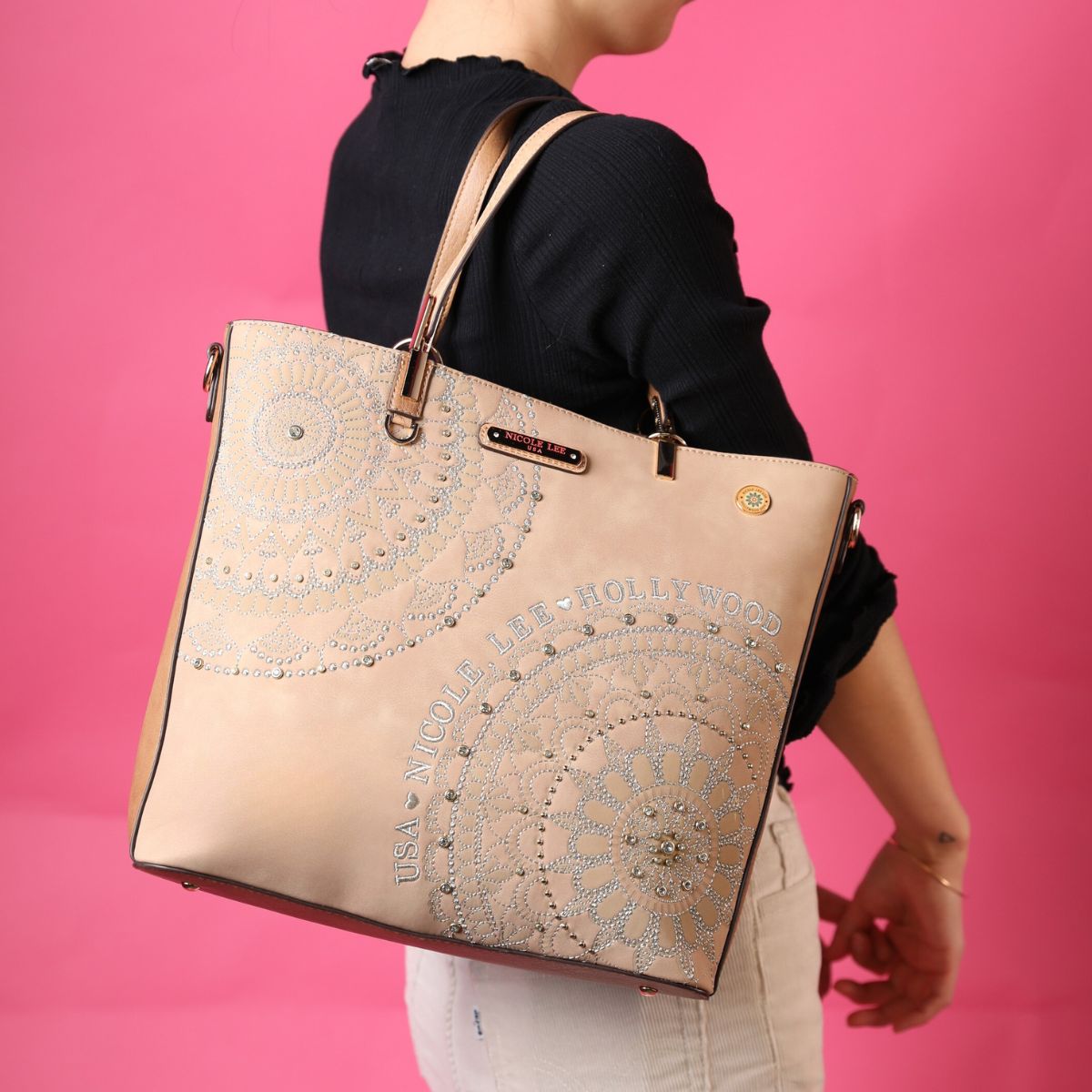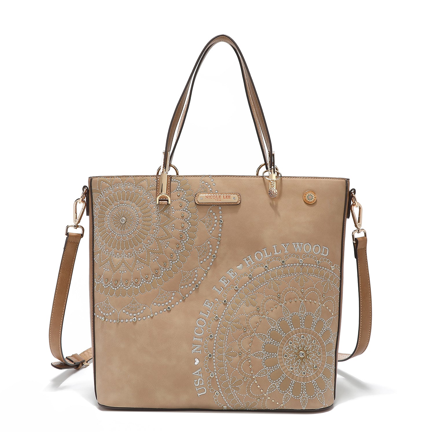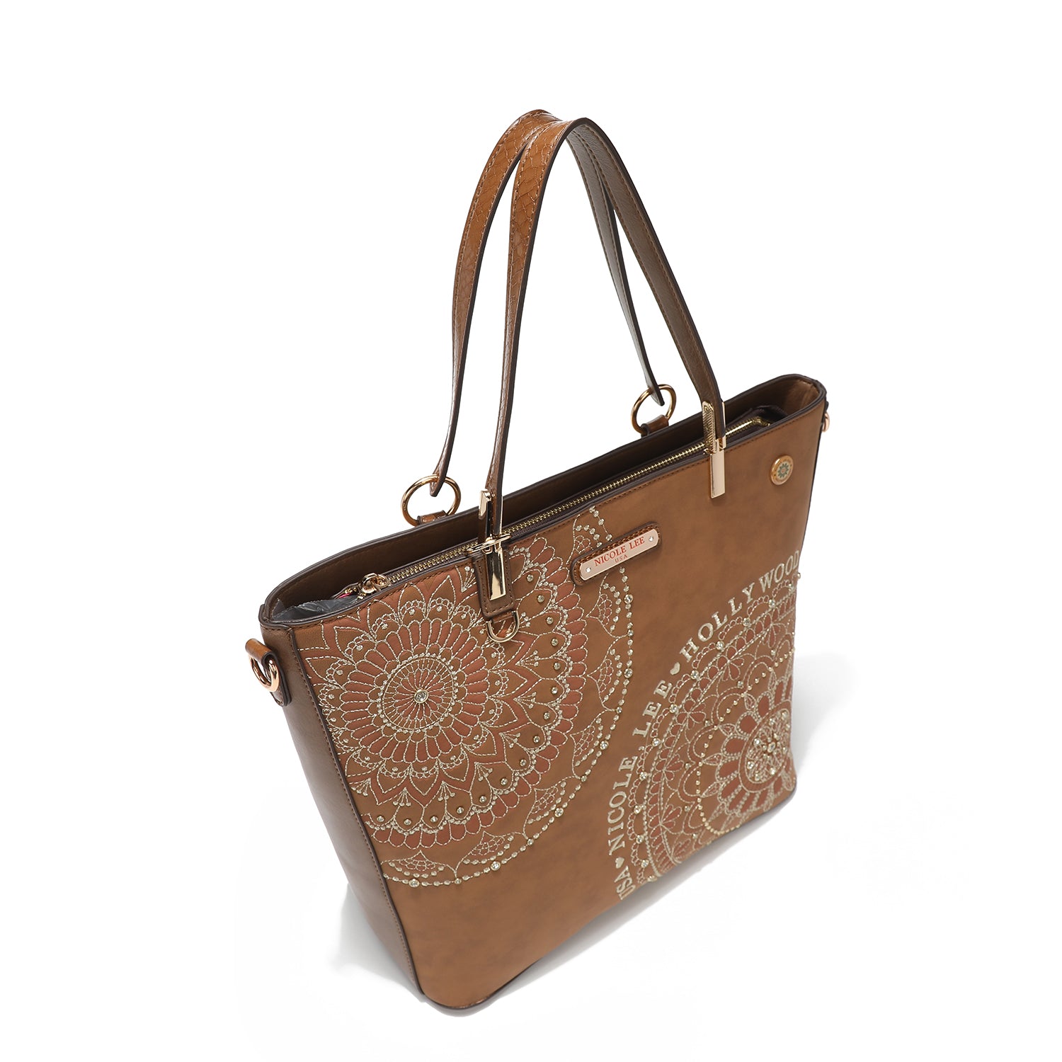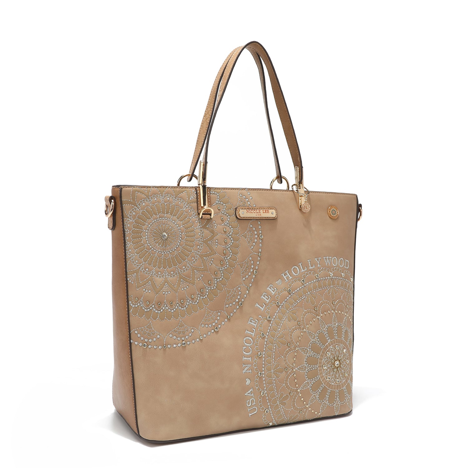 - Front design is embellished with diamond rhinestones and metallic stitching