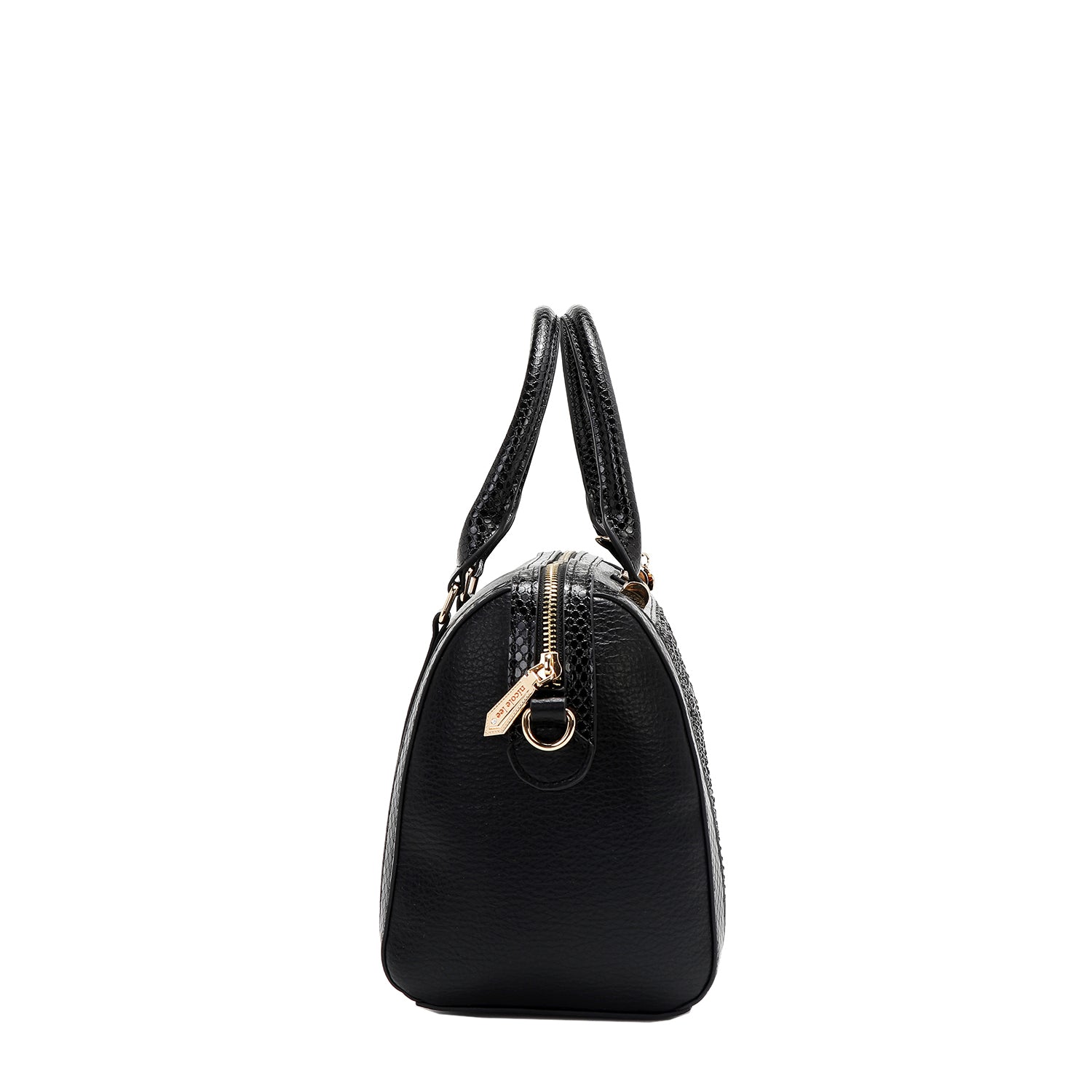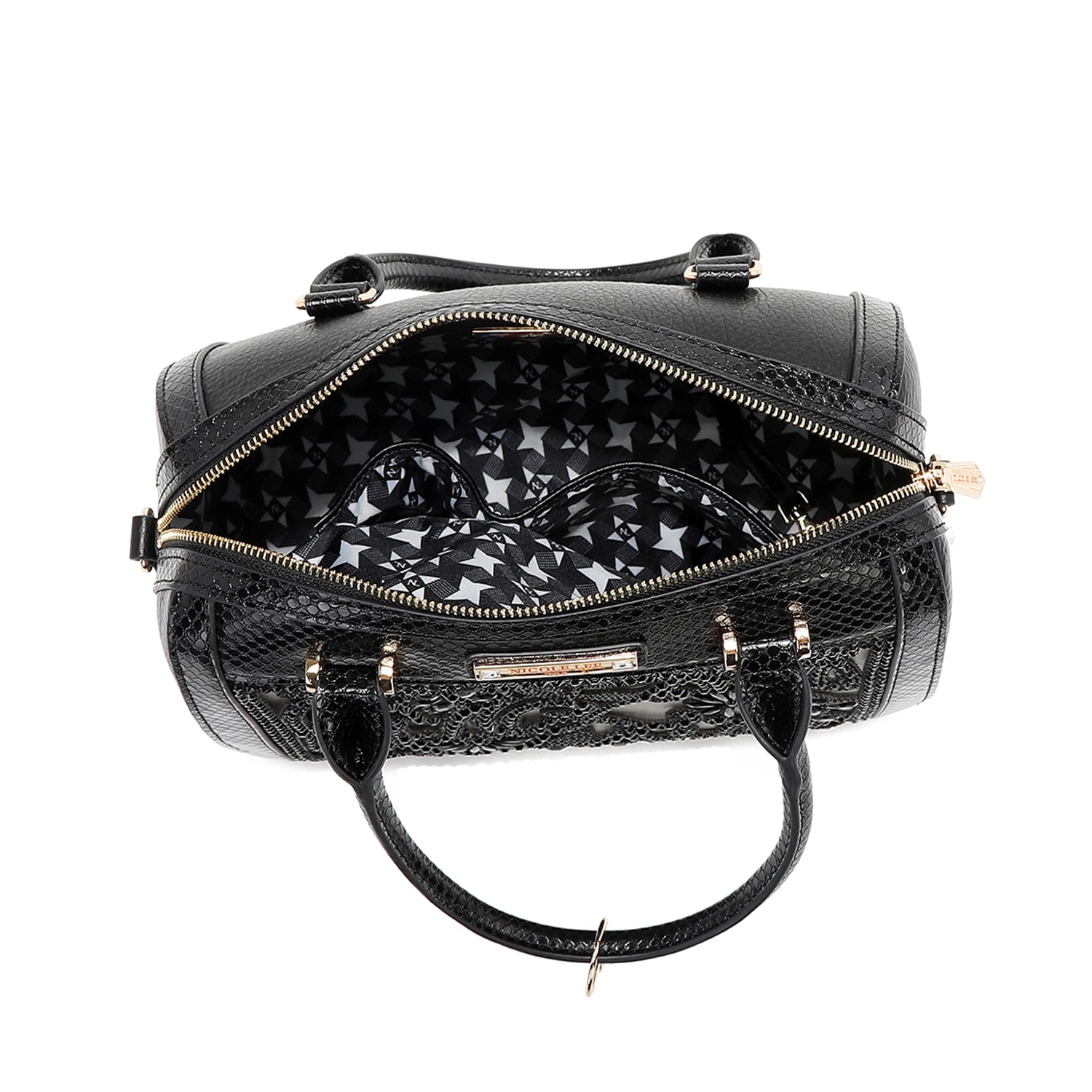 Our black lace boston bag radiates elegance with sophisticated faux snakeskin accents and a lace lasercut design, embellished with tonal rhinestones for a touch of sparkle and glam. A discreet back slip pocket keeps your cards easily accessible, making it the perfect accessory for on-the-go style.