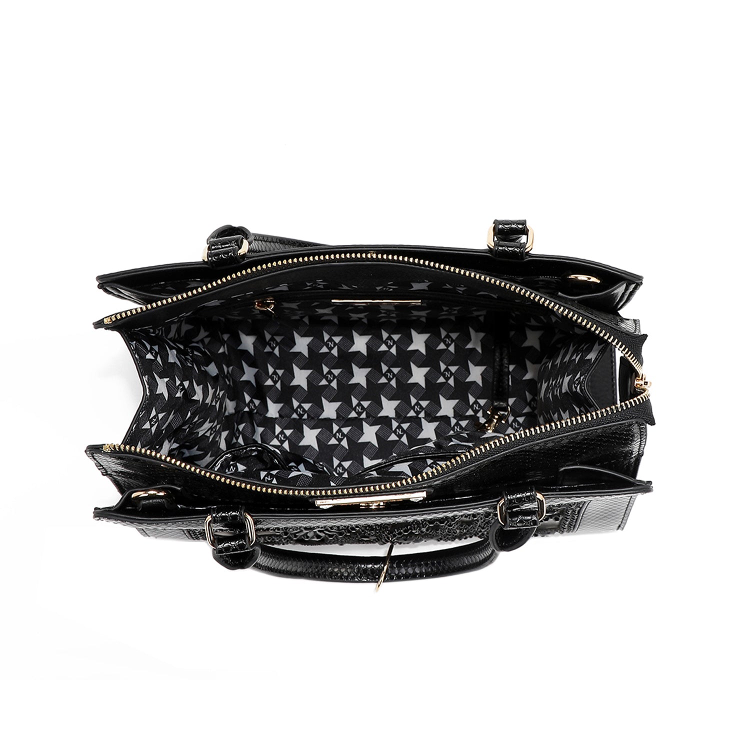 - Pebbled vegan leather exterior with faux snakeskin accents