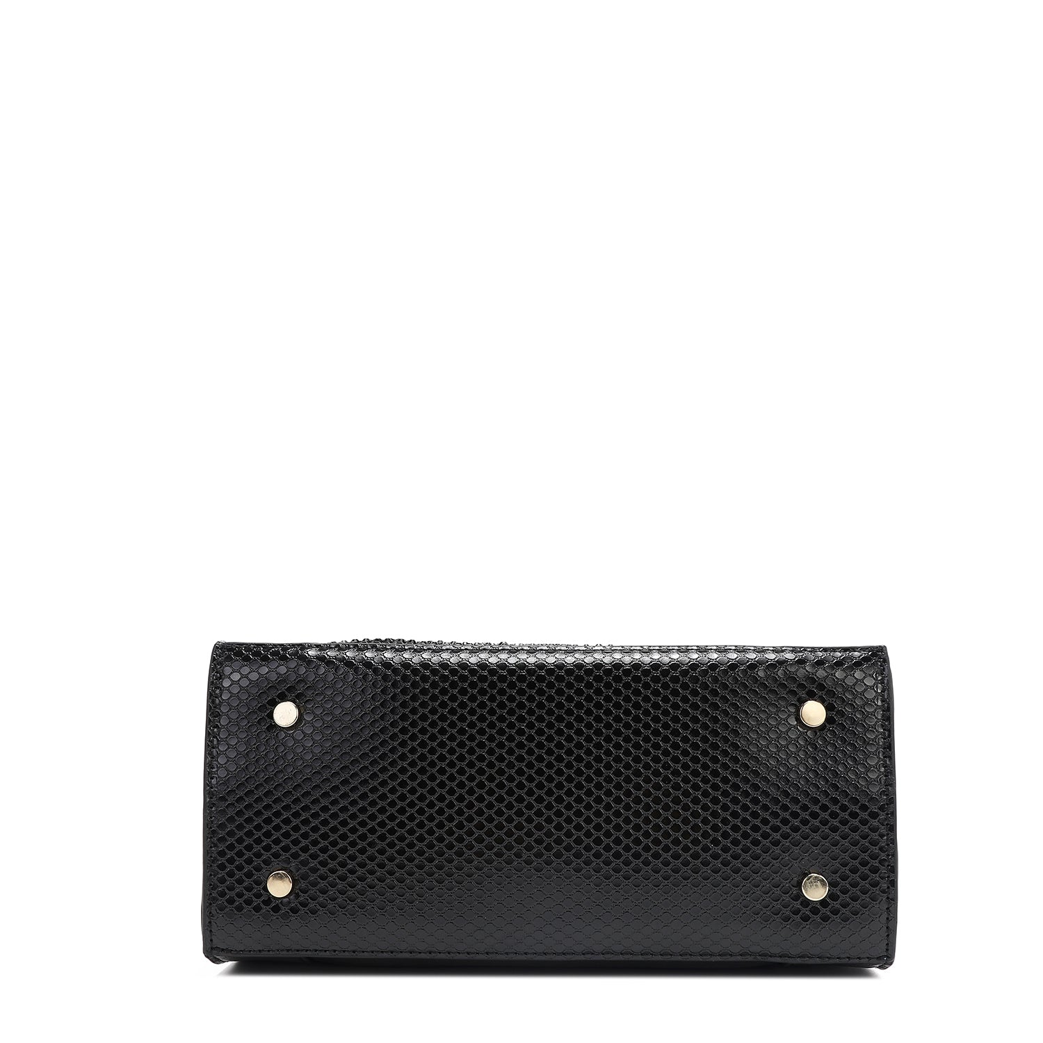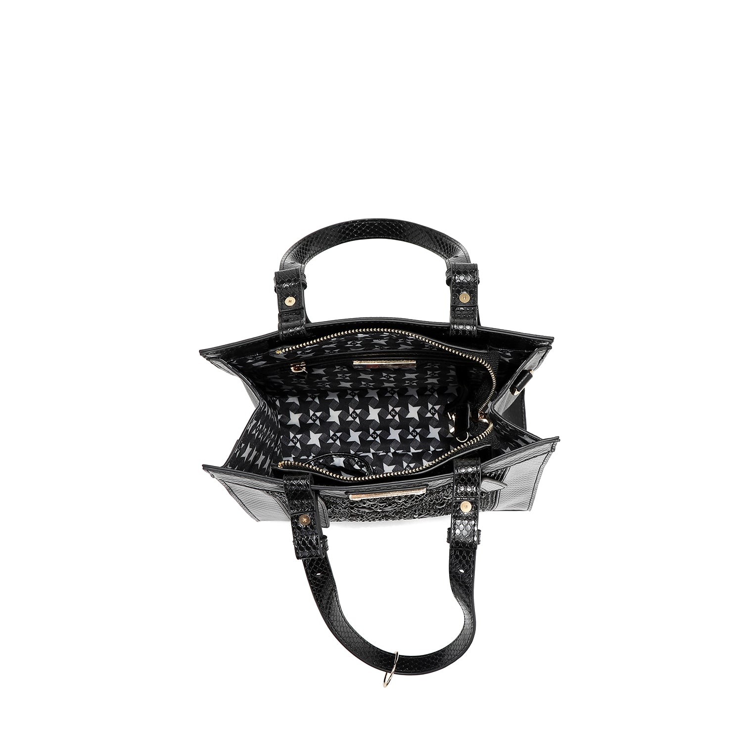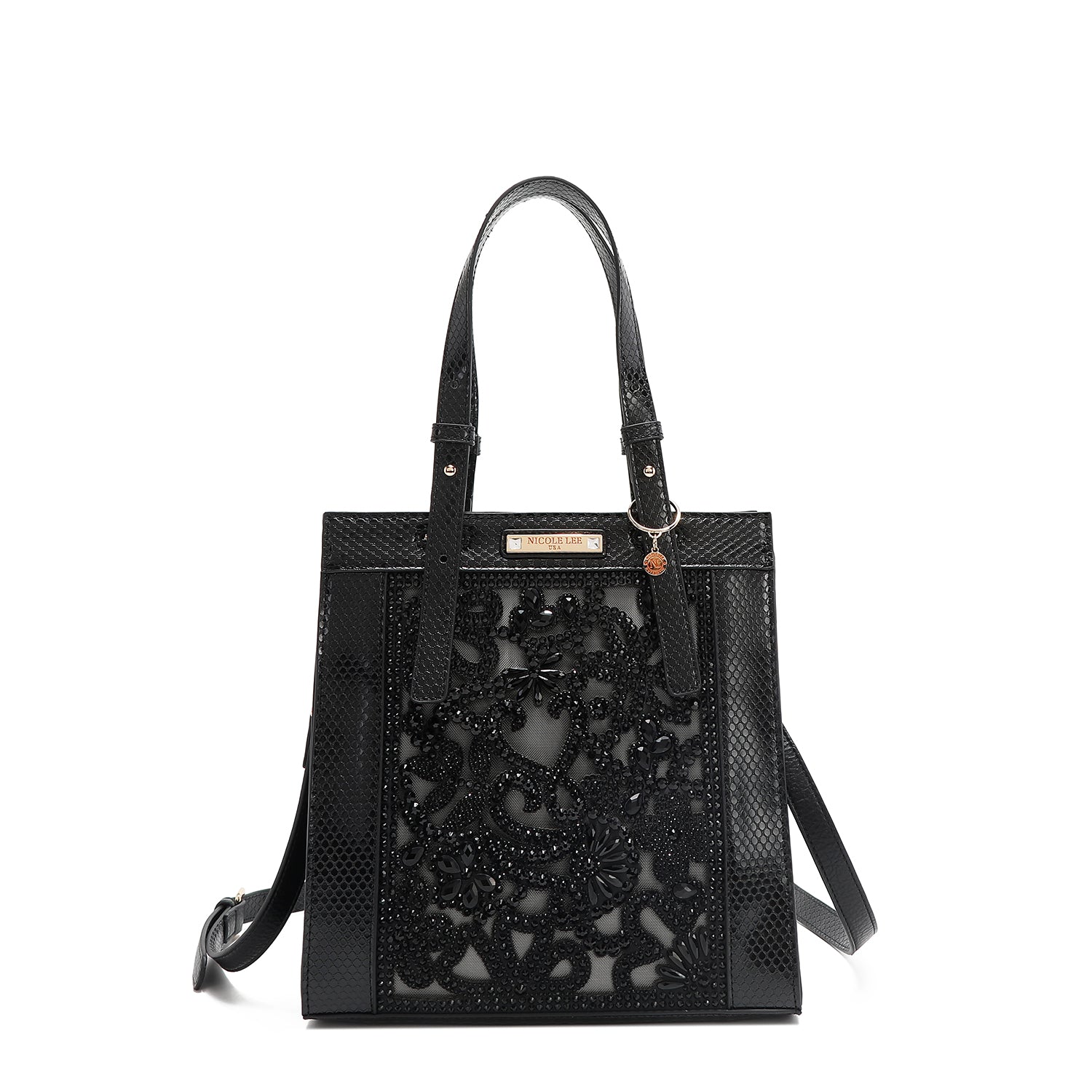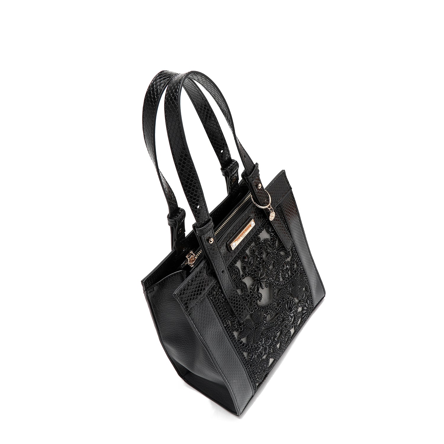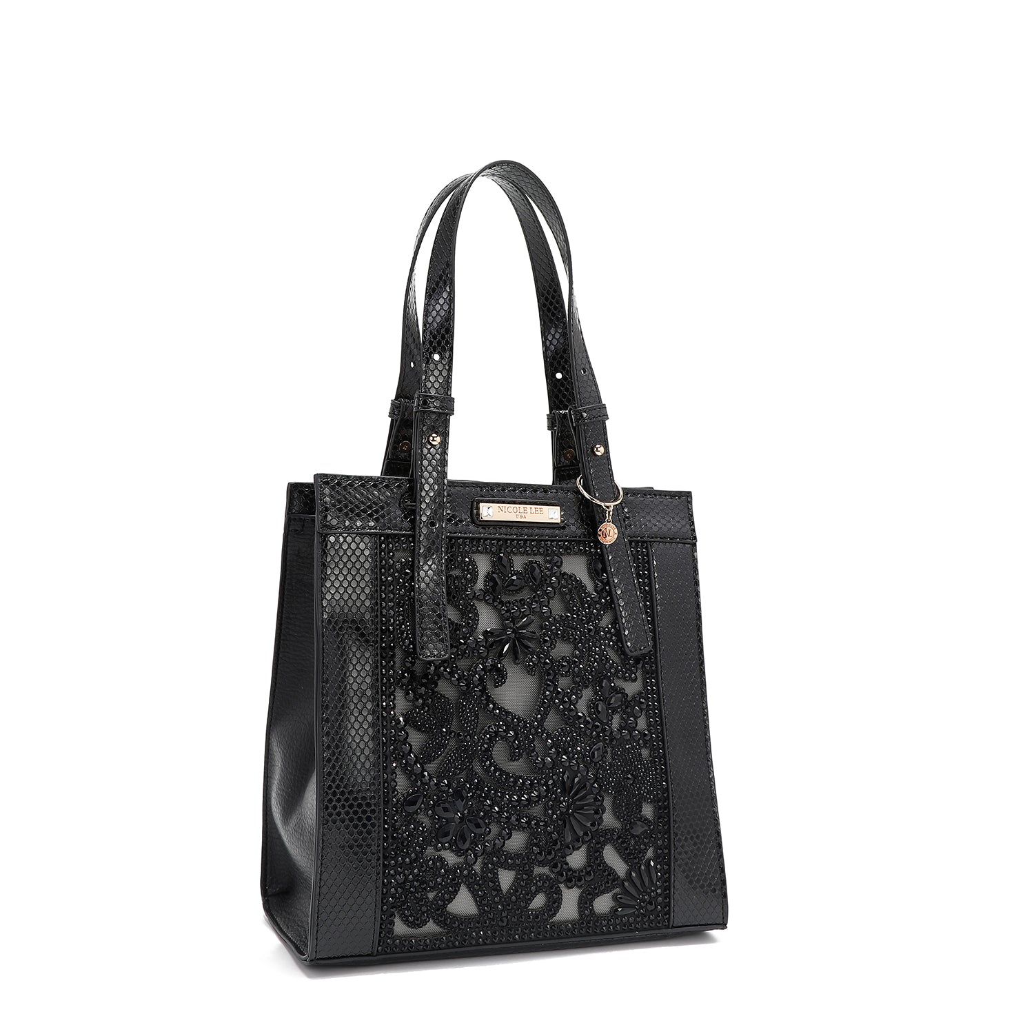 Tote your essentials in refined style with our demure lace handbag, crafted in faux snakeskin and adorned with shimmering tonal rhinestones. Thoughtful touches, like metal feet at the base, keep the bag elevated and protected, ensuring both elegance and durability.