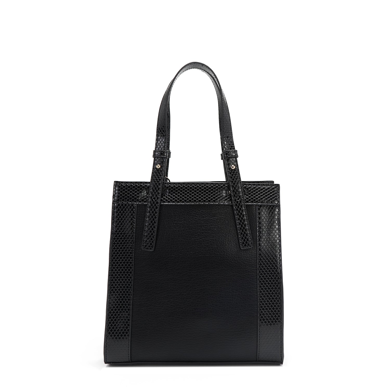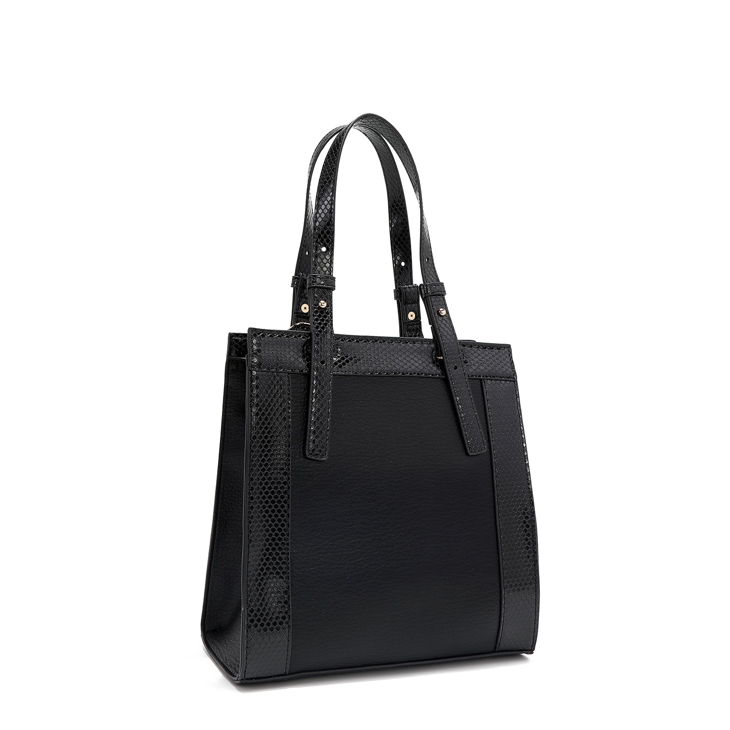 - Pebbled vegan leather exterior with faux snakeskin accents