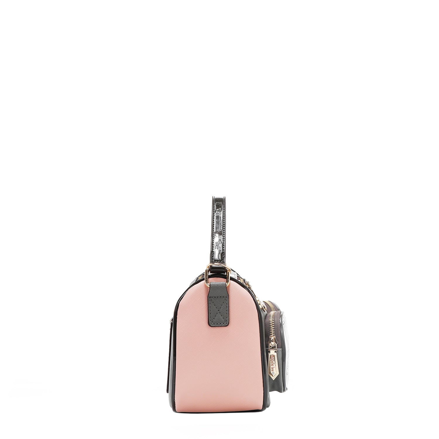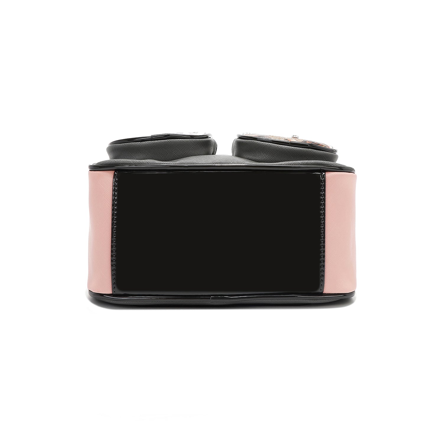 - Vegan leather exterior with glossy patent leather accents
