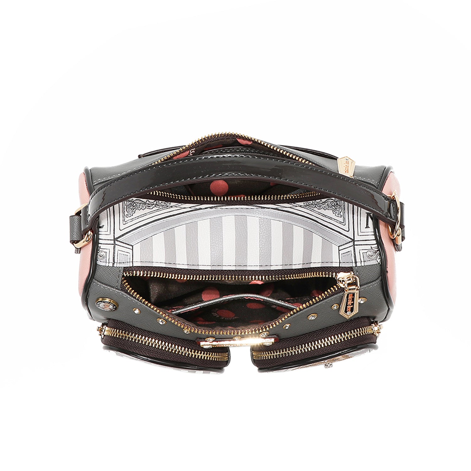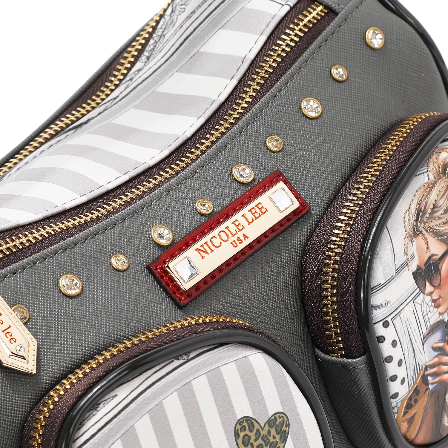 - Logo engraved nameplate with diamond rhinestones and zipper pulls
