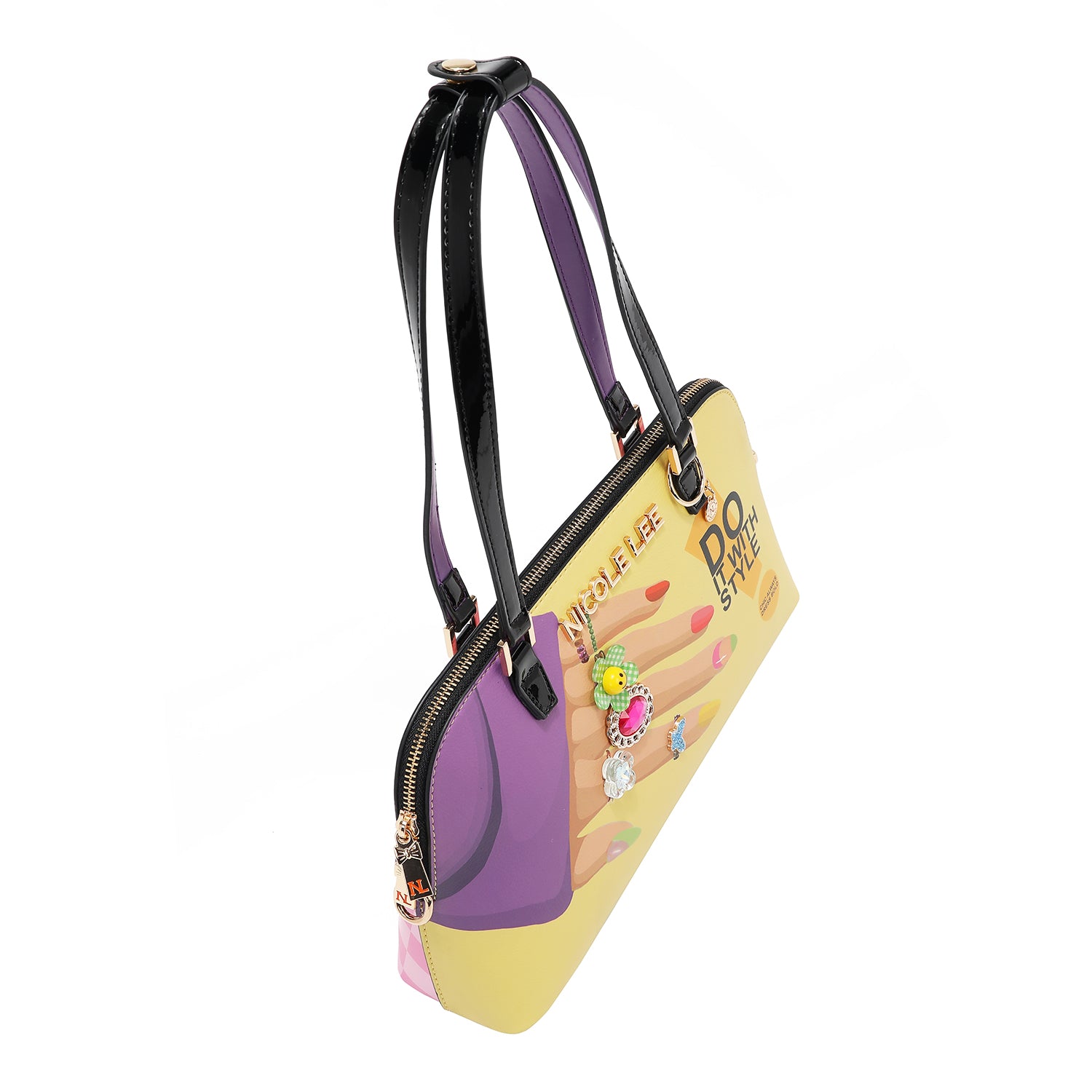 Curvy, cute, and covered in couture-inspired nail art, the Nail Polish dome shoulder bag gives your look that glossy-finish energy. The dome silhouette adds a touch of retro, while the hand-painted-inspired print and 3D detailing keep it playful. Who needs subtle when you’ve got this much sparkle?