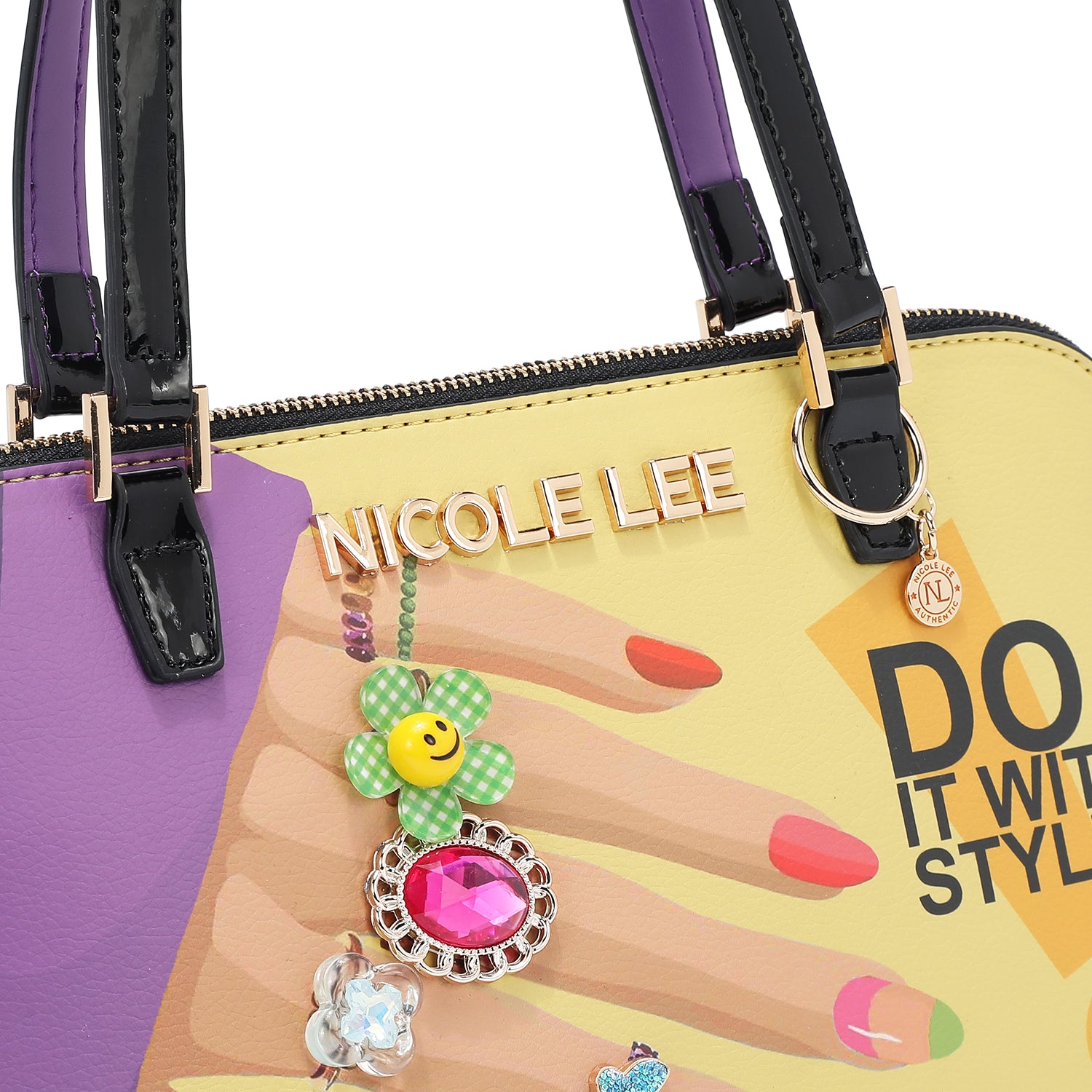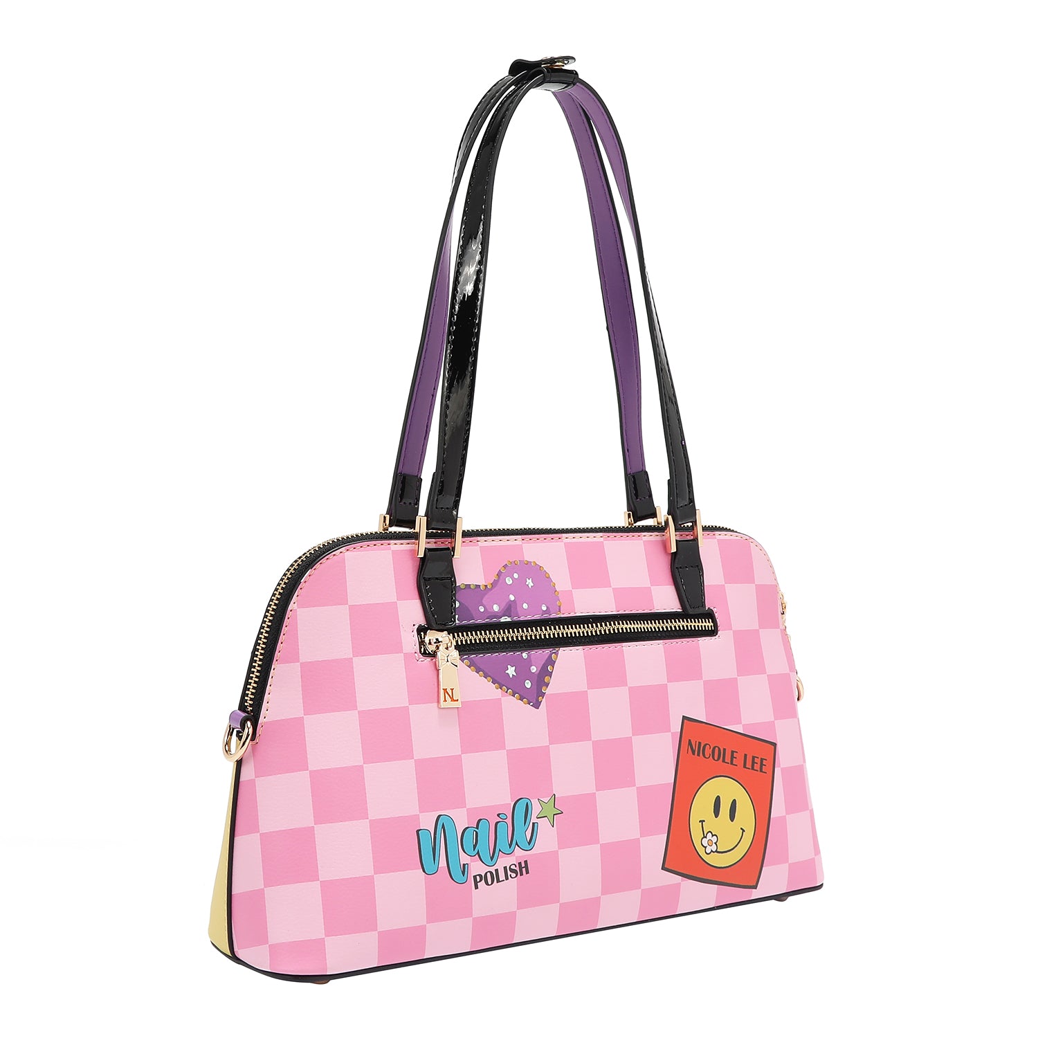 - Vegan leather exterior with glossy patent leather accents