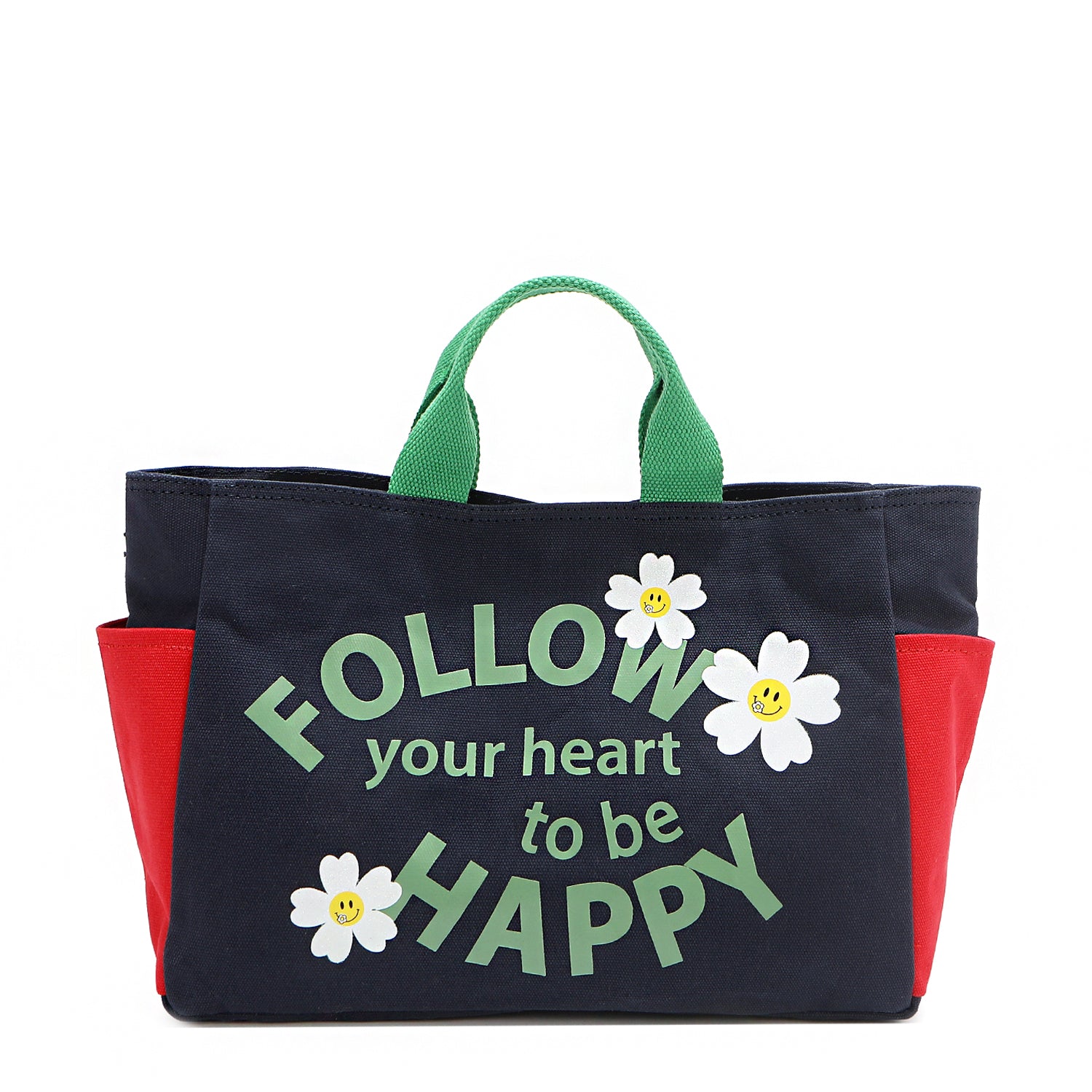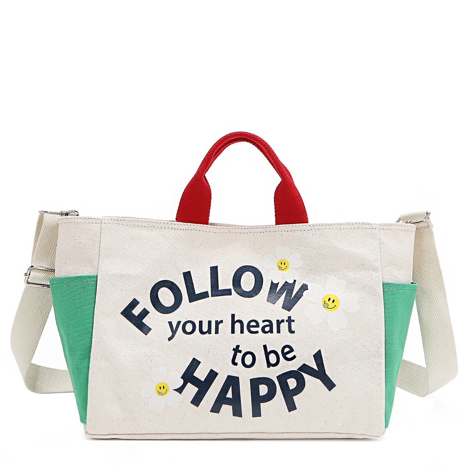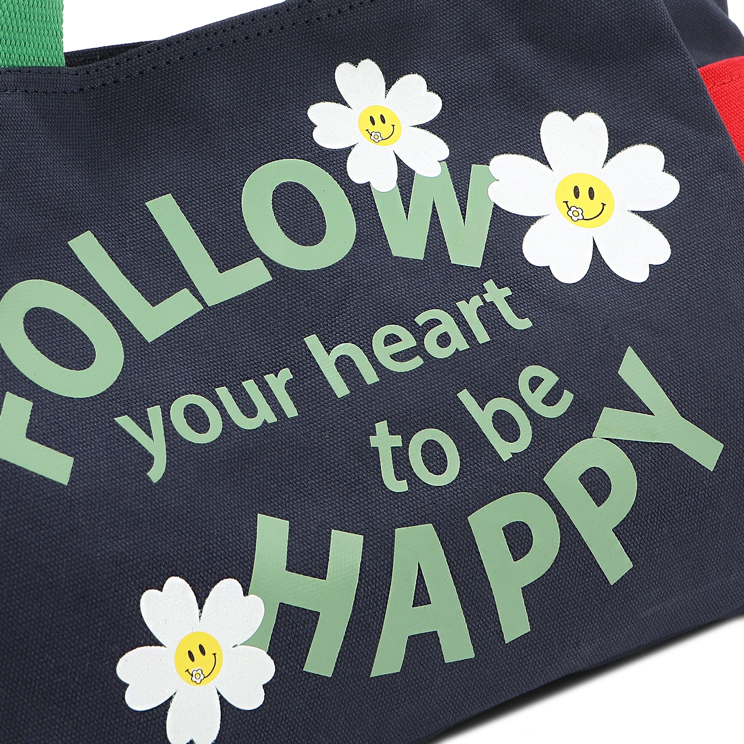 Your new everyday essential with a happiness boost! Elodie features handy side pockets and a spacious interior—perfect for your notebooks, wallet, snacks, and more. With its “Follow Your Heart to Be Happy” message and glittery floral smiley accents, this roomy bag is designed to bring bliss wherever you go!