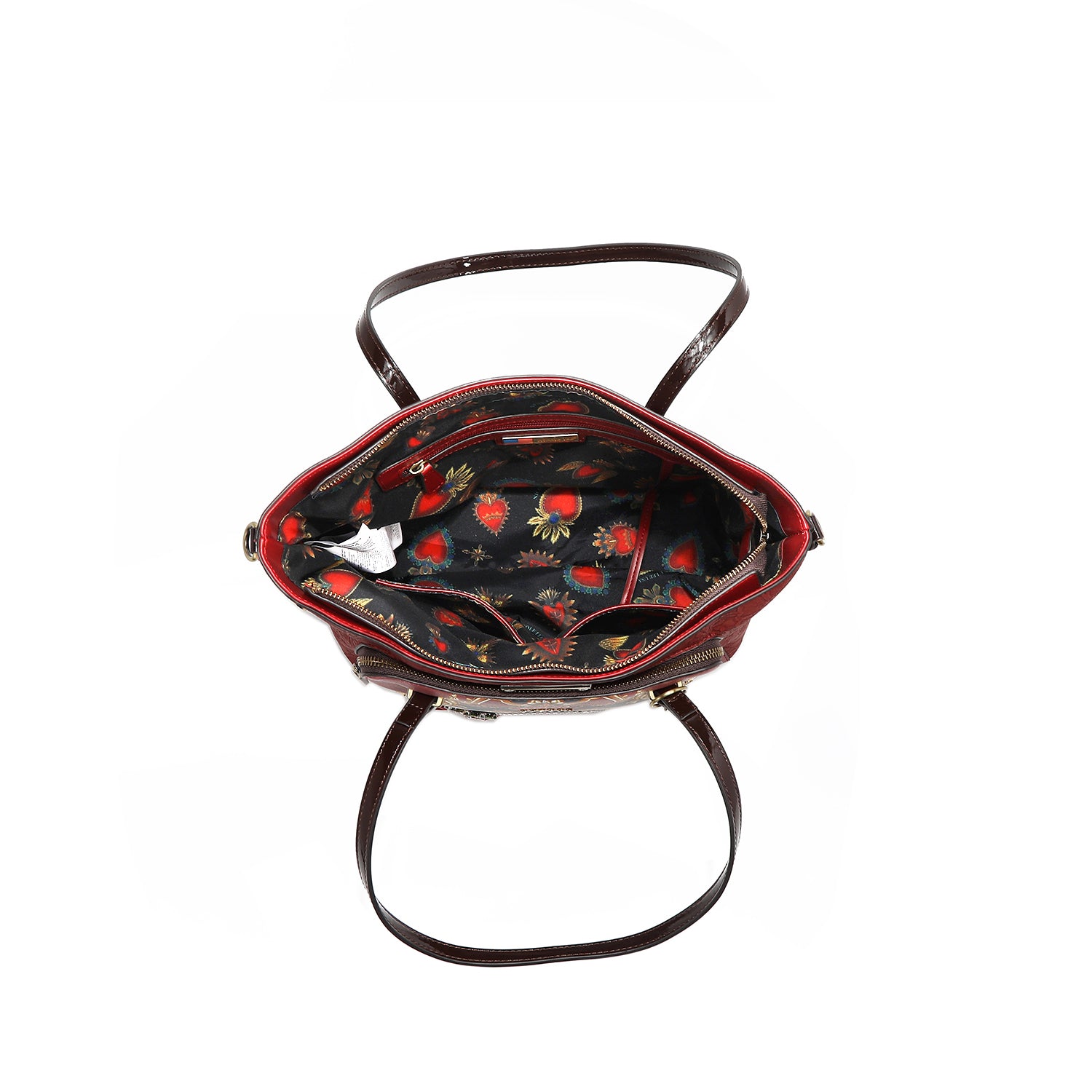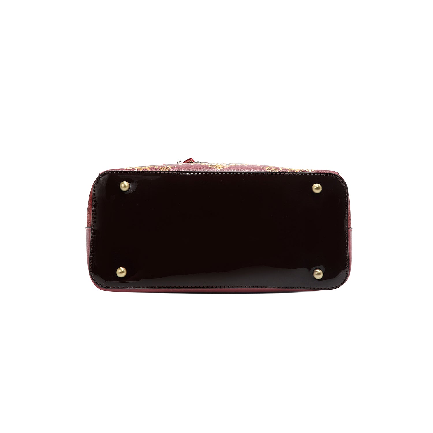 - Pebbled vegan leather exterior with glossy patent leather accents