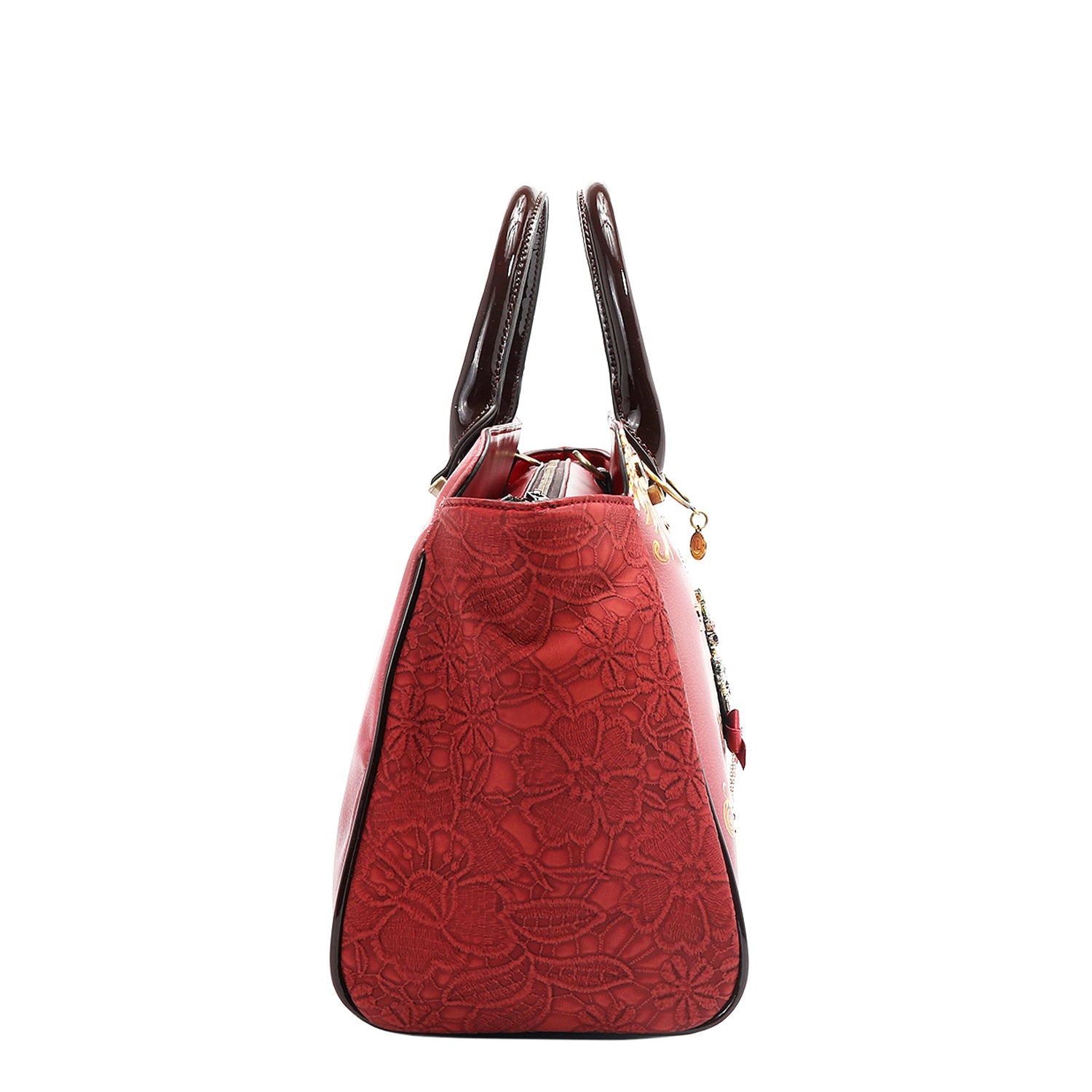 - Pebbled vegan leather exterior with glossy patent leather accents