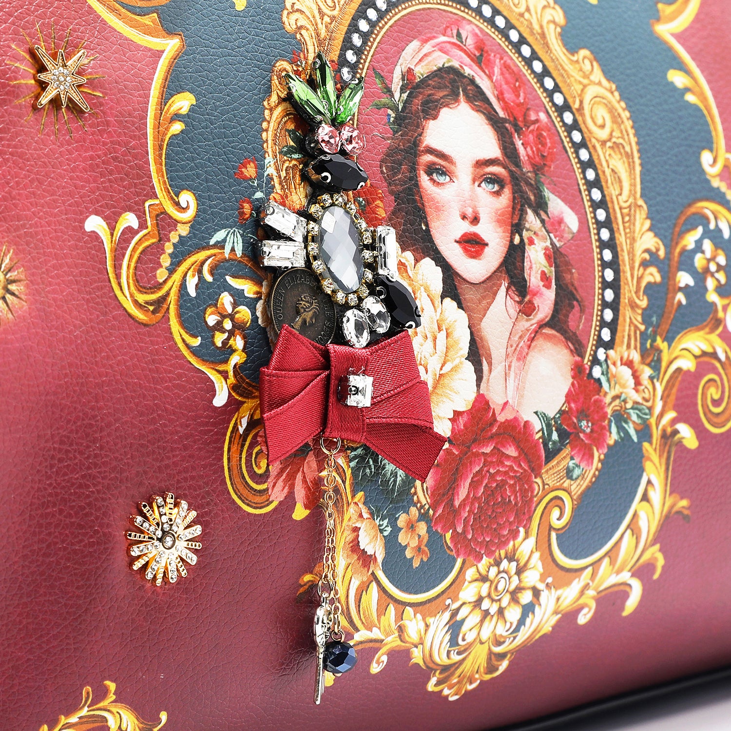 - Front is embellished with stones, bow and tassel charm details
