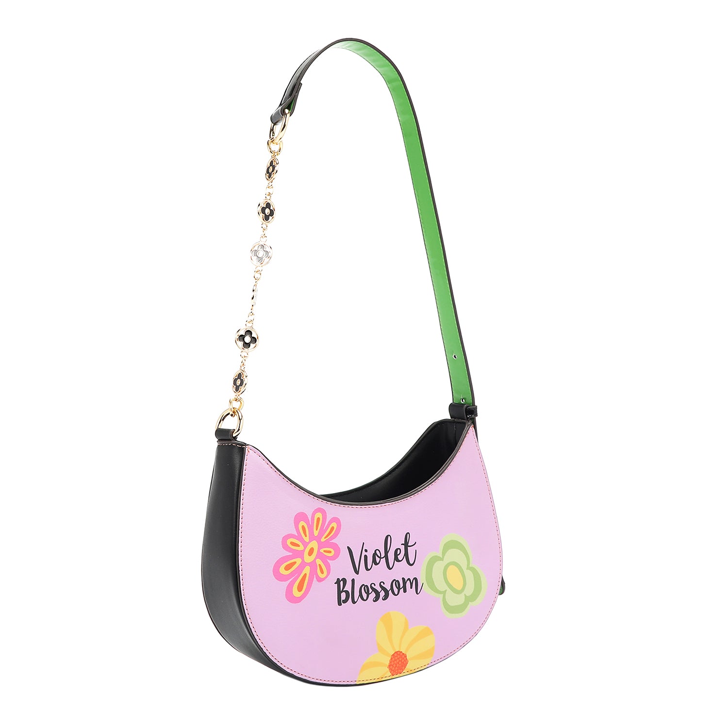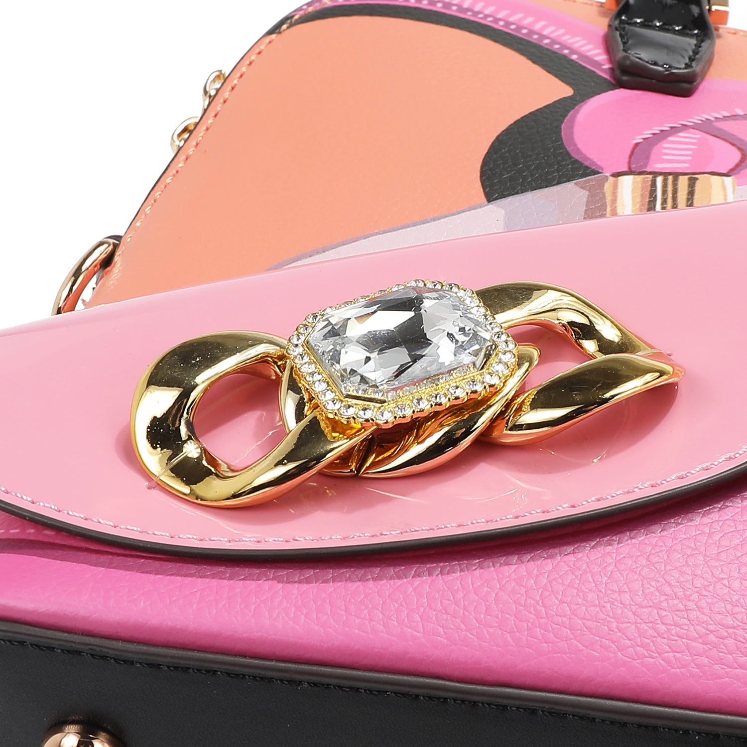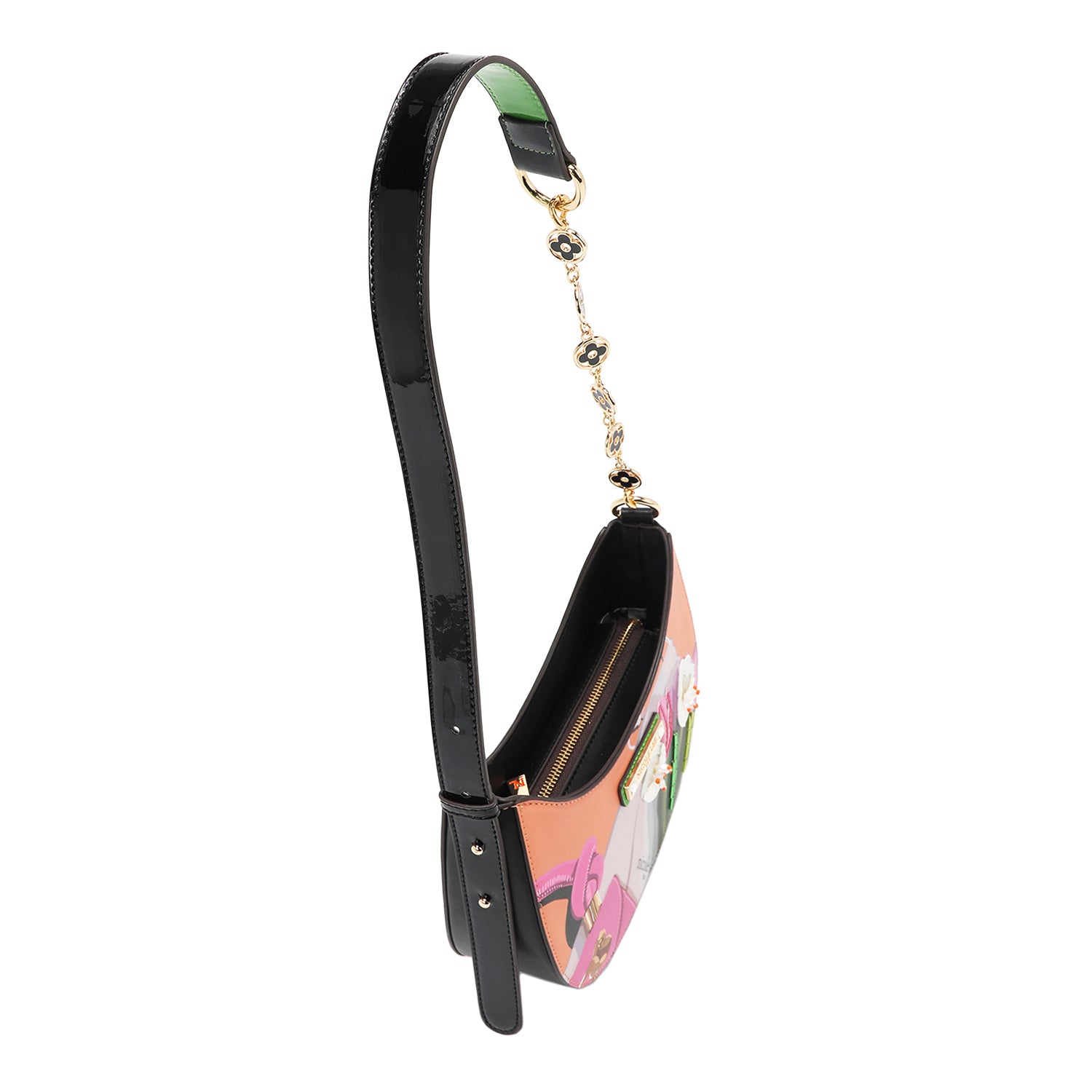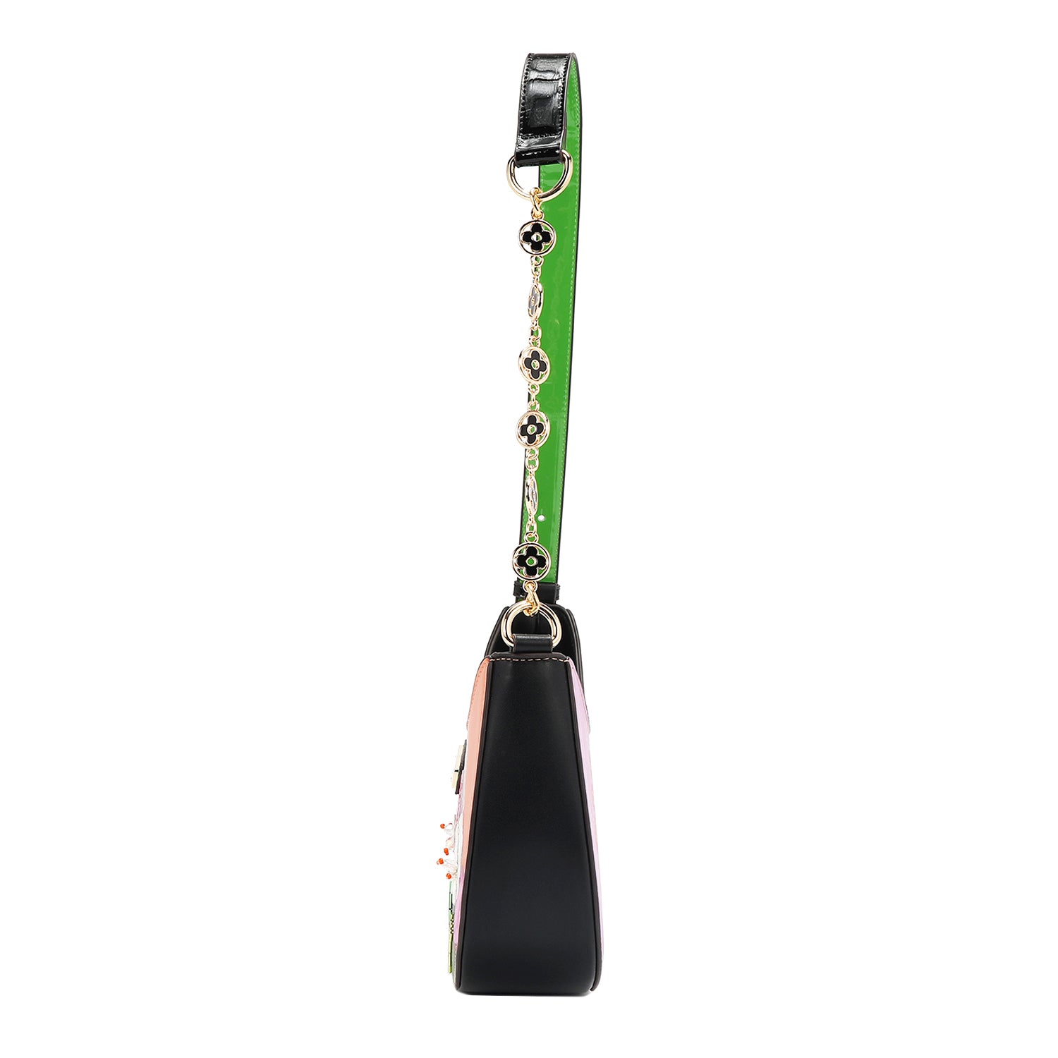Effortlessly refined yet undeniably bold, this statement piece exudes sophistication with a daring edge. Its sleek silhouette is beautifully accented by a luxe gold-tone chain-link and vegan leather shoulder strap, adorned with intricate black flower motifs that add a touch of romance and intrigue. A perfect balance of elegance and modern allure, this bag is destined to captivate.