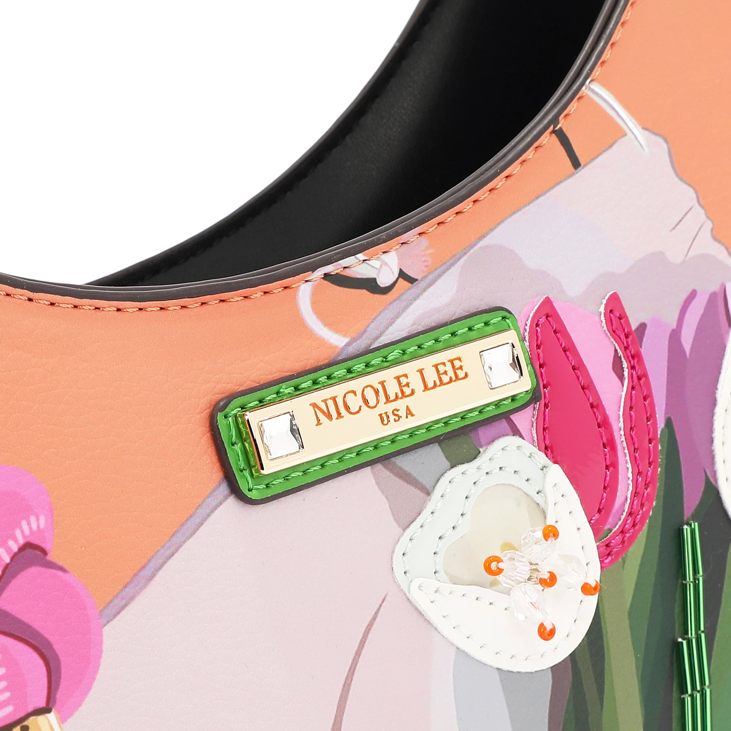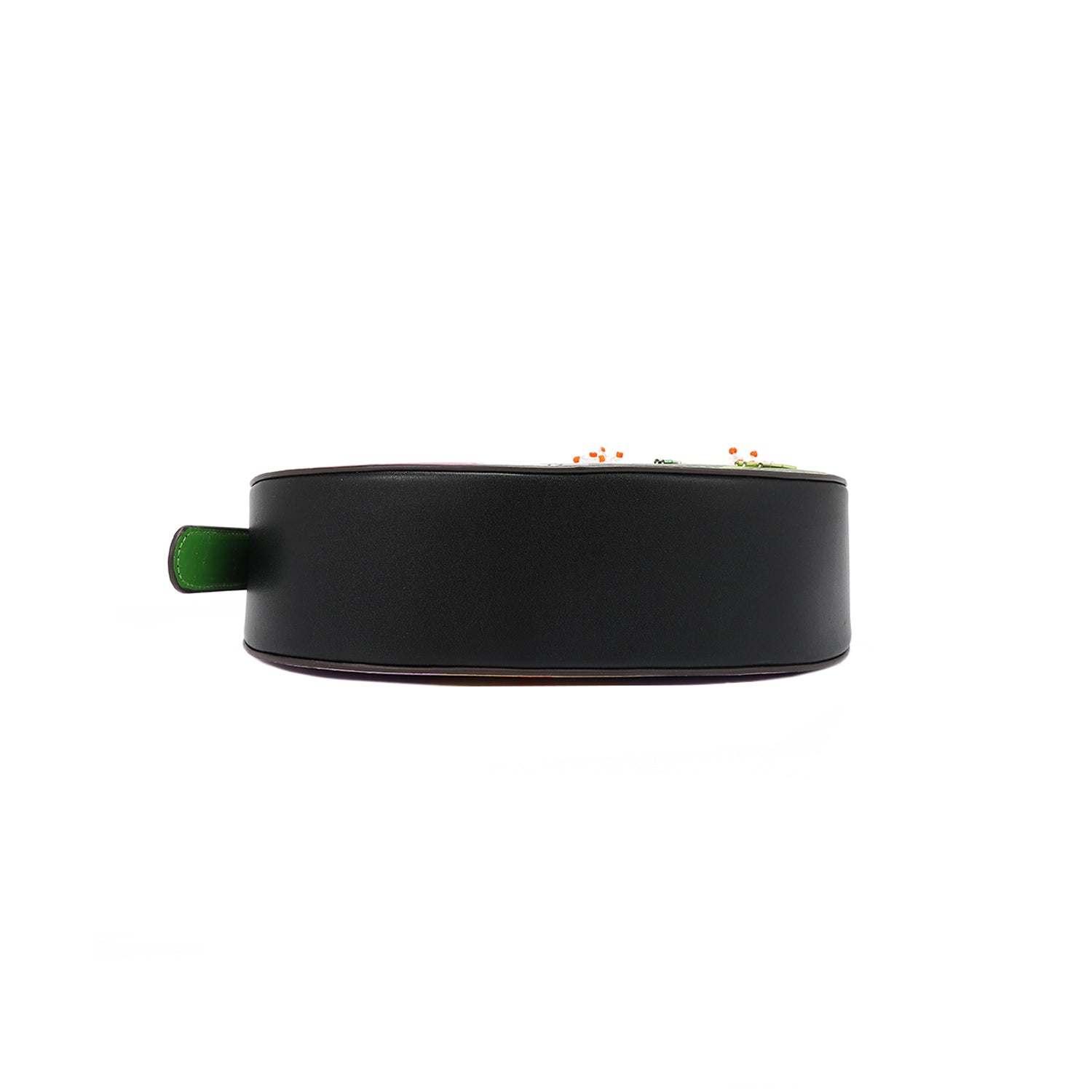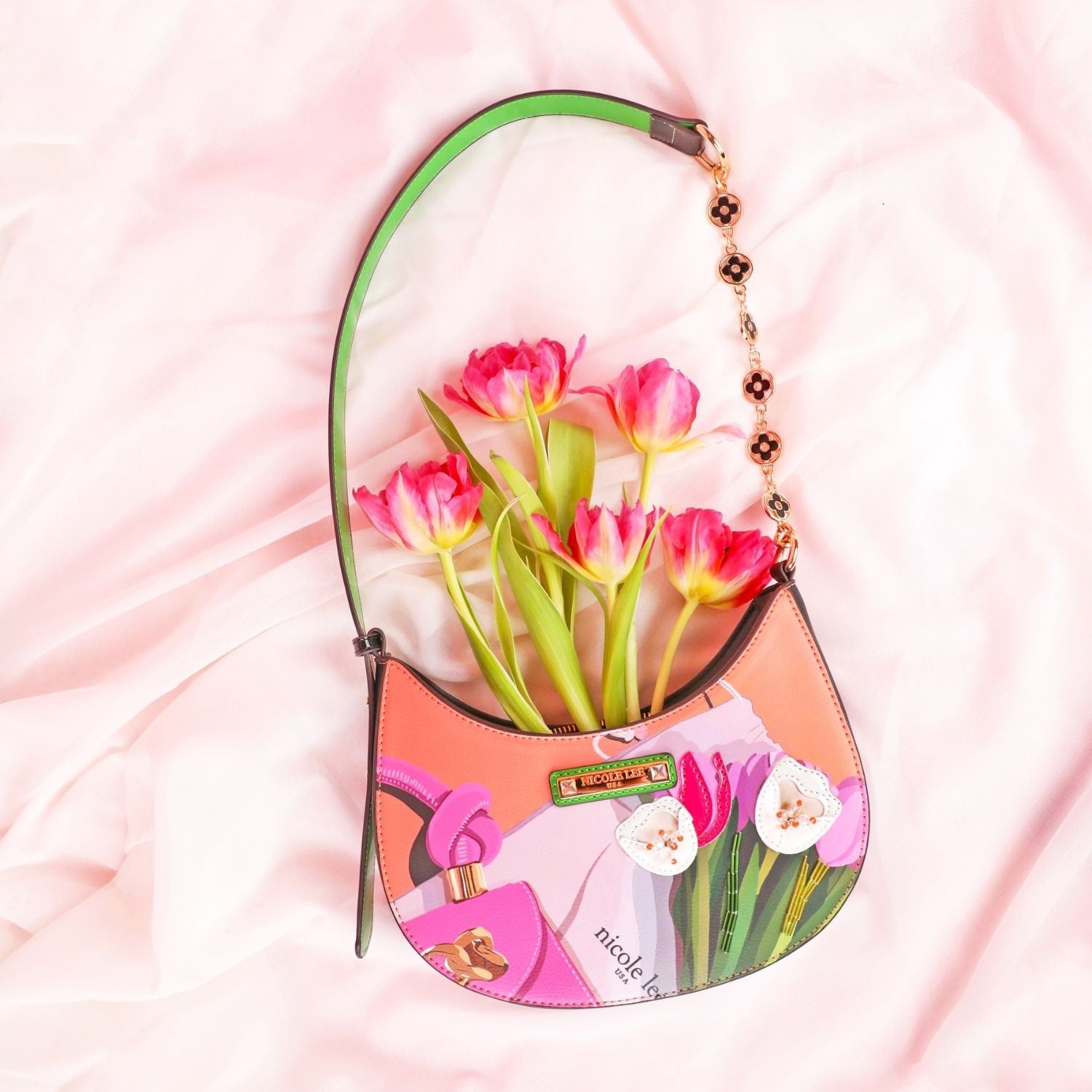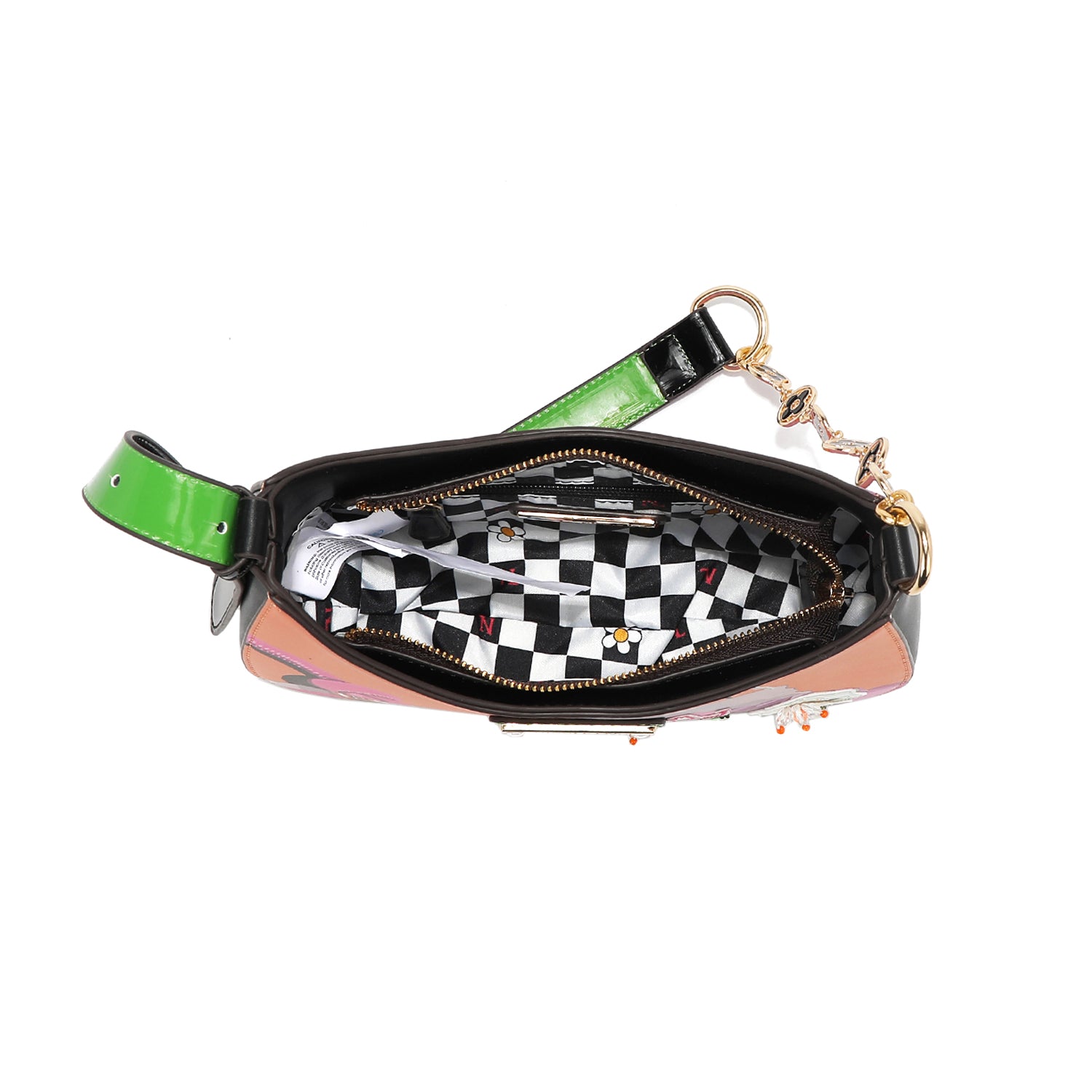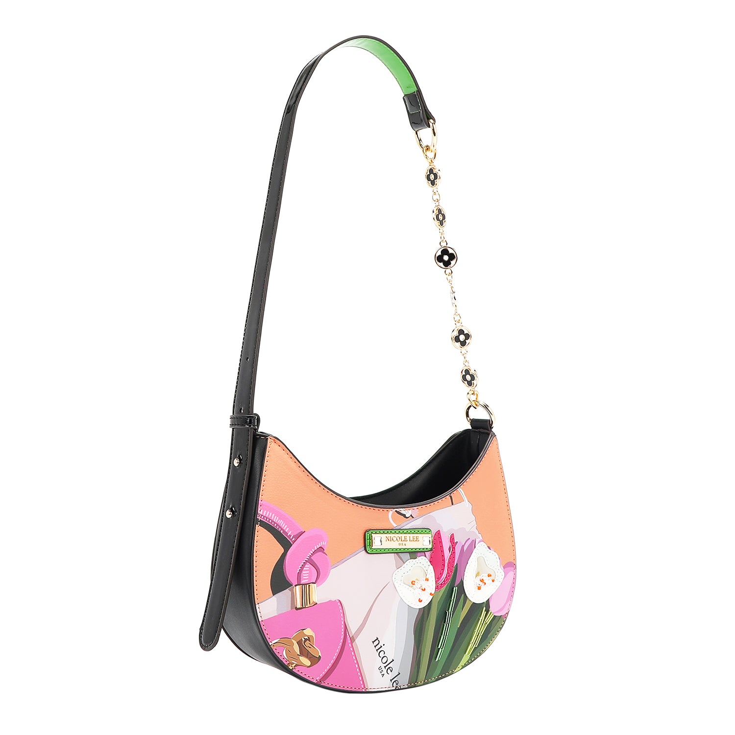 Effortlessly refined yet undeniably bold, this statement piece exudes sophistication with a daring edge. Its sleek silhouette is beautifully accented by a luxe gold-tone chain-link and vegan leather shoulder strap, adorned with intricate black flower motifs that add a touch of romance and intrigue. A perfect balance of elegance and modern allure, this bag is destined to captivate.