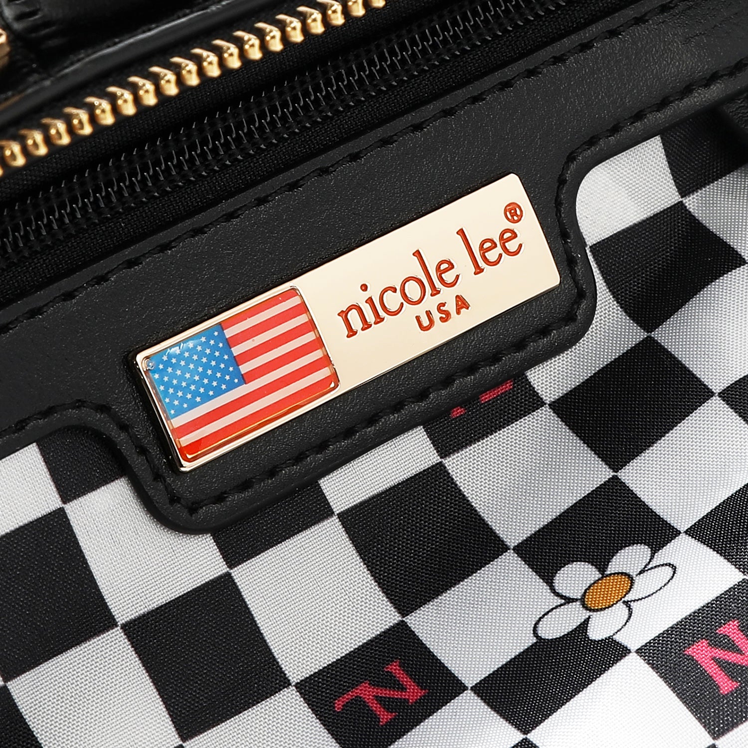- Logo engraved bow zipper pulls and nameplate with diamond rhinestones