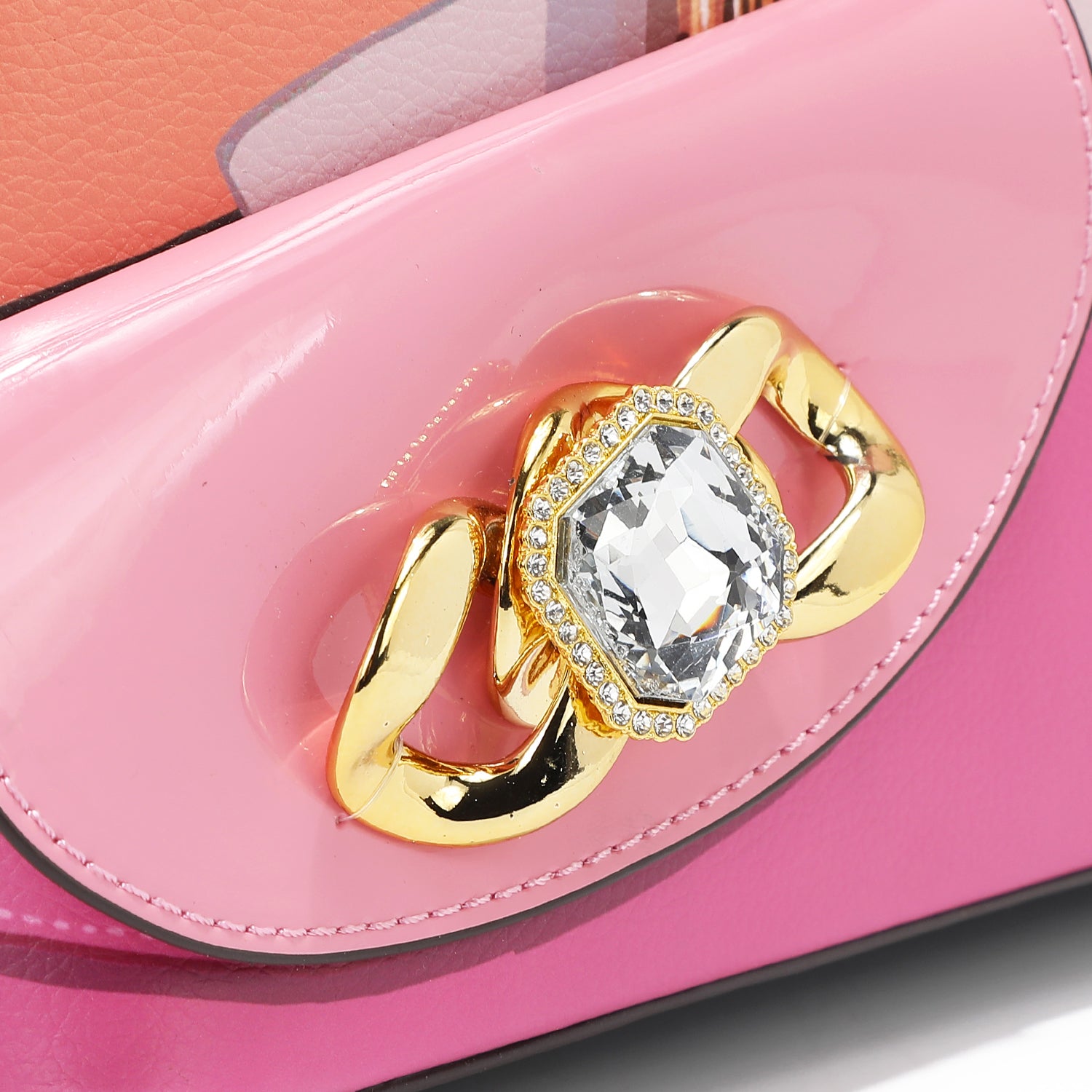 - Logo engraved bow zipper pulls and nameplate with diamond rhinestones