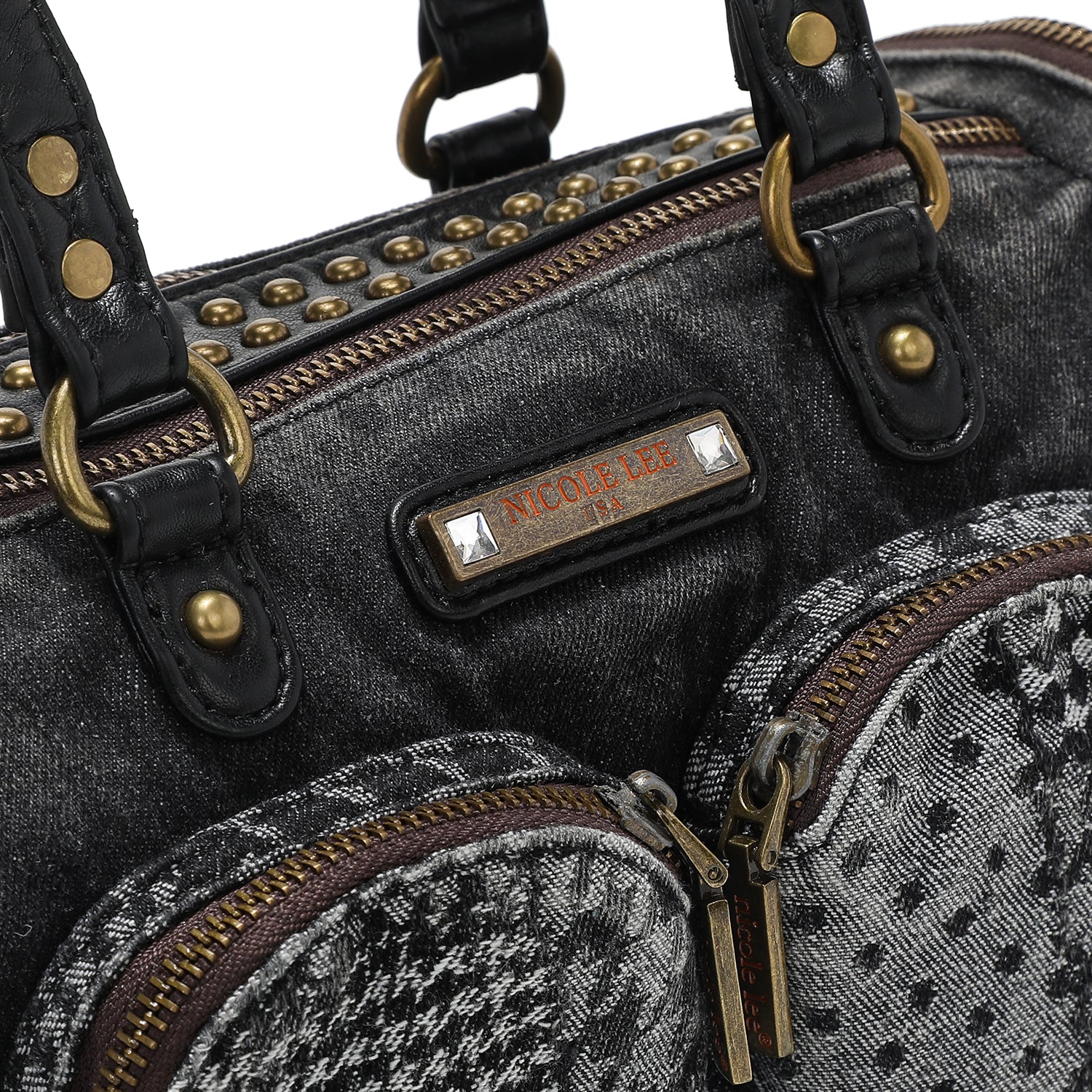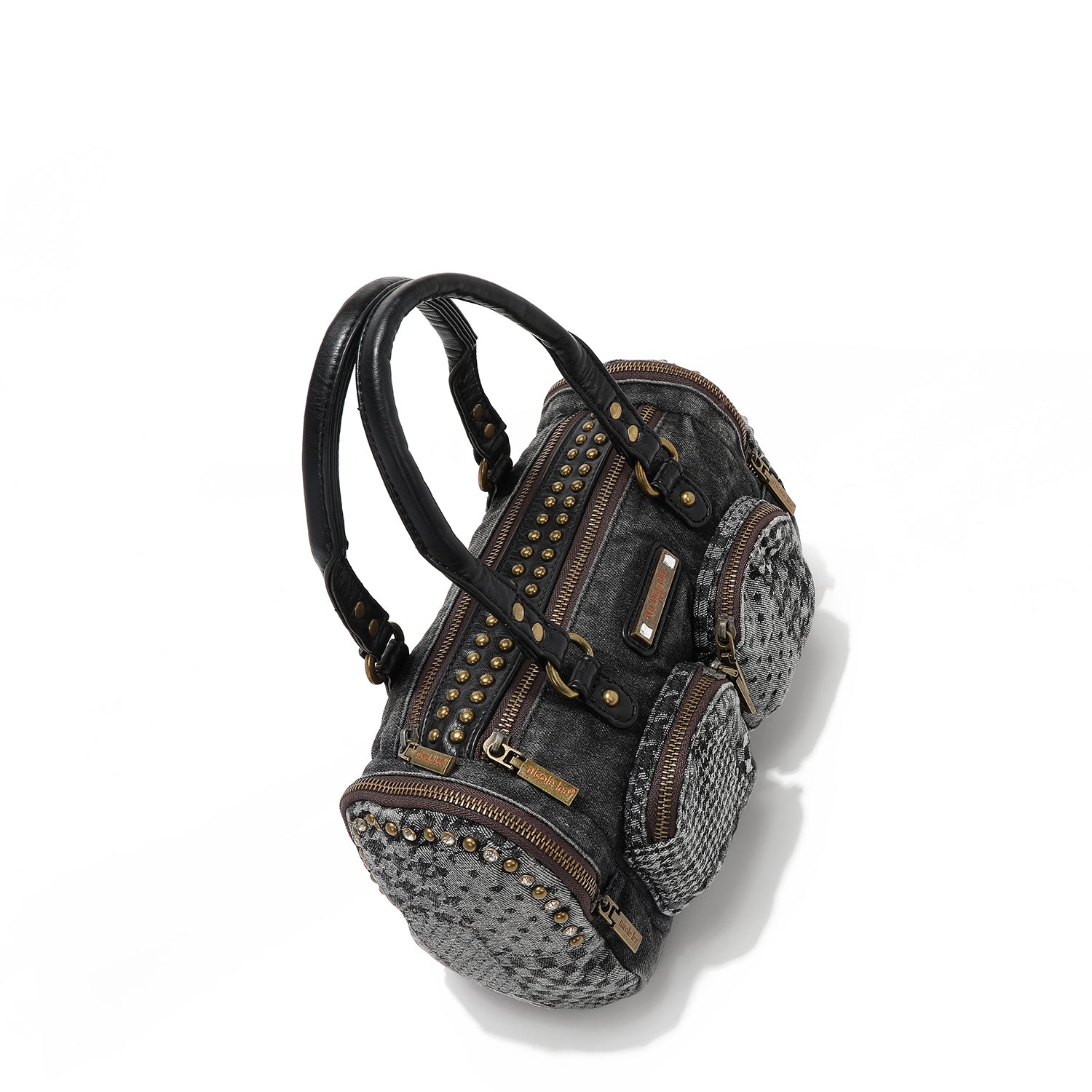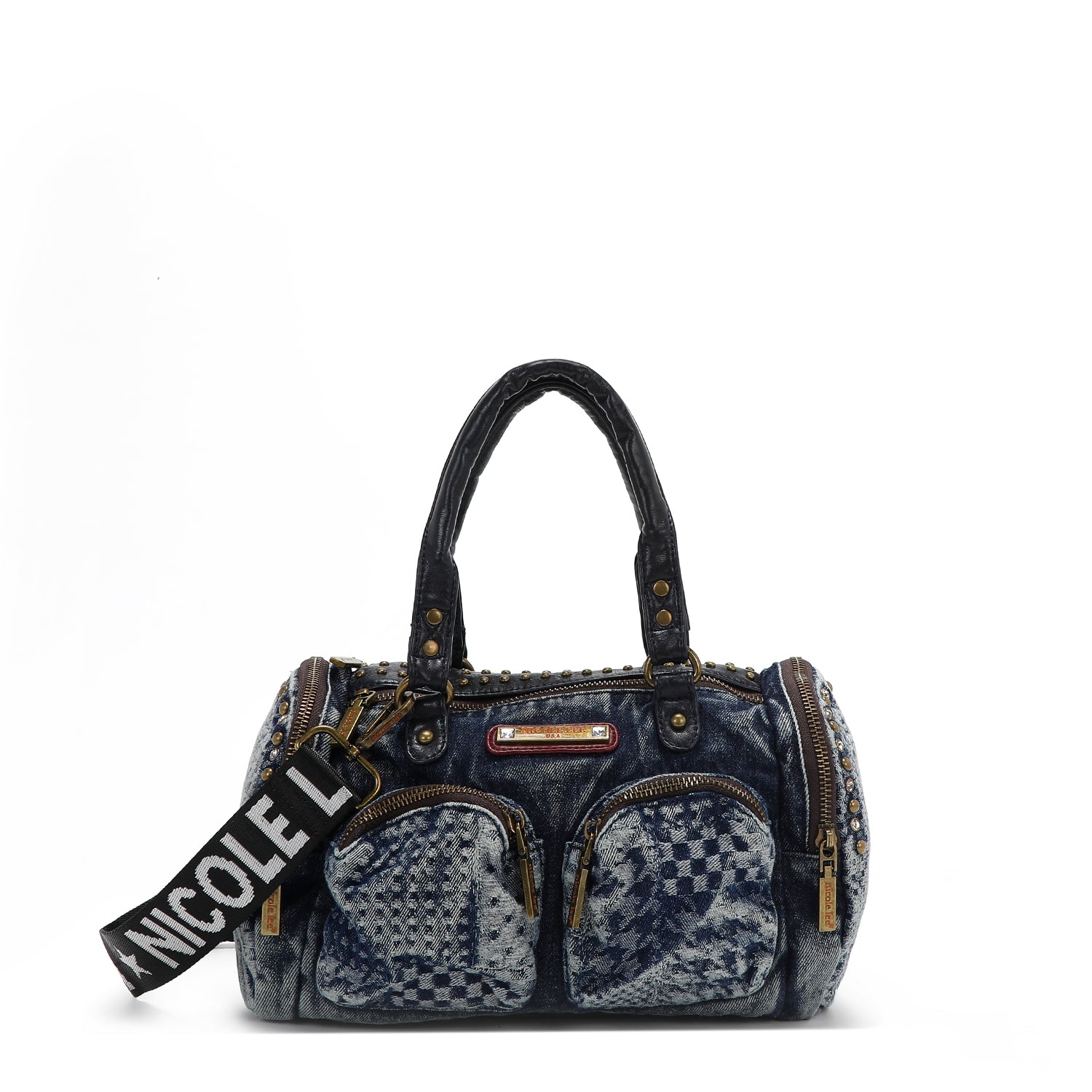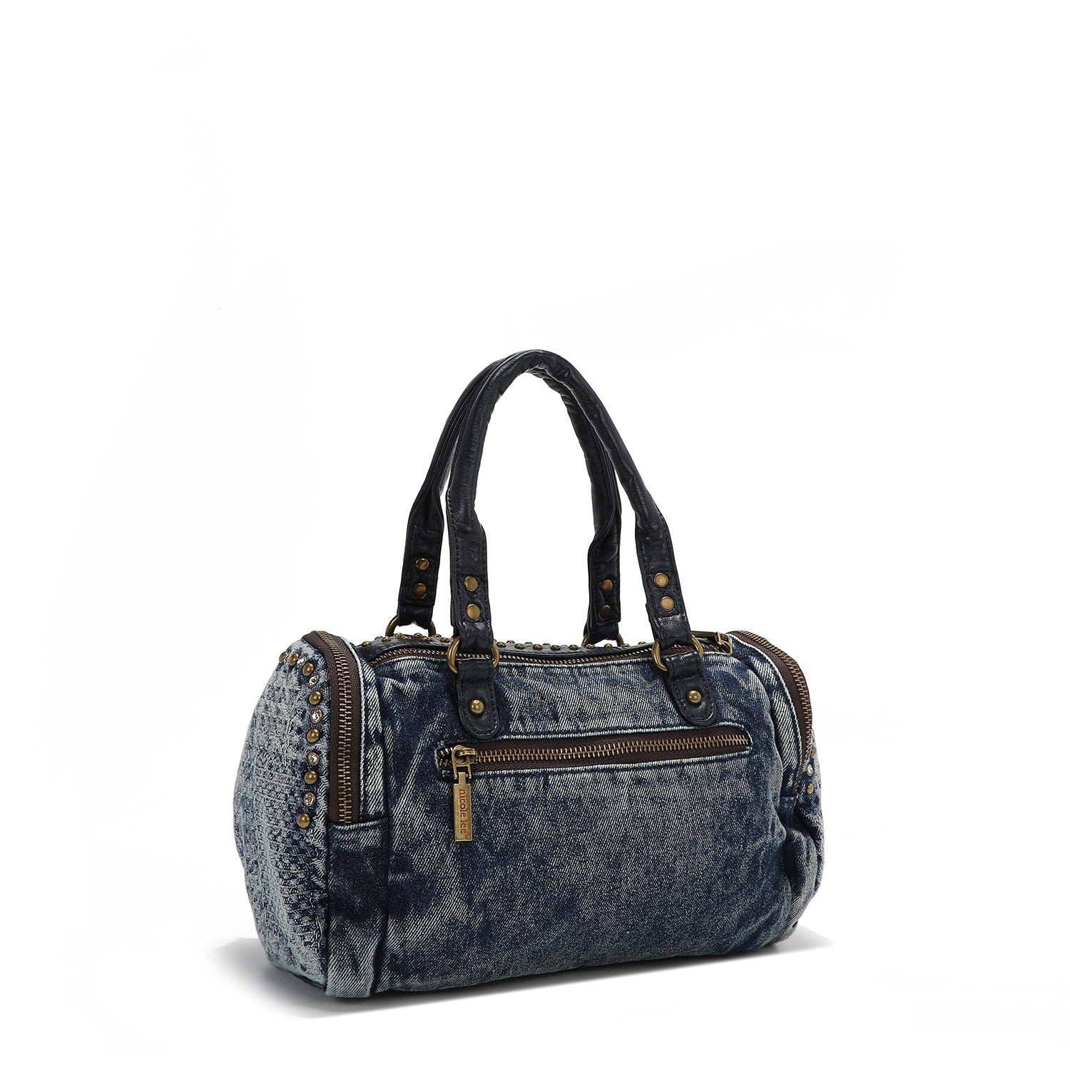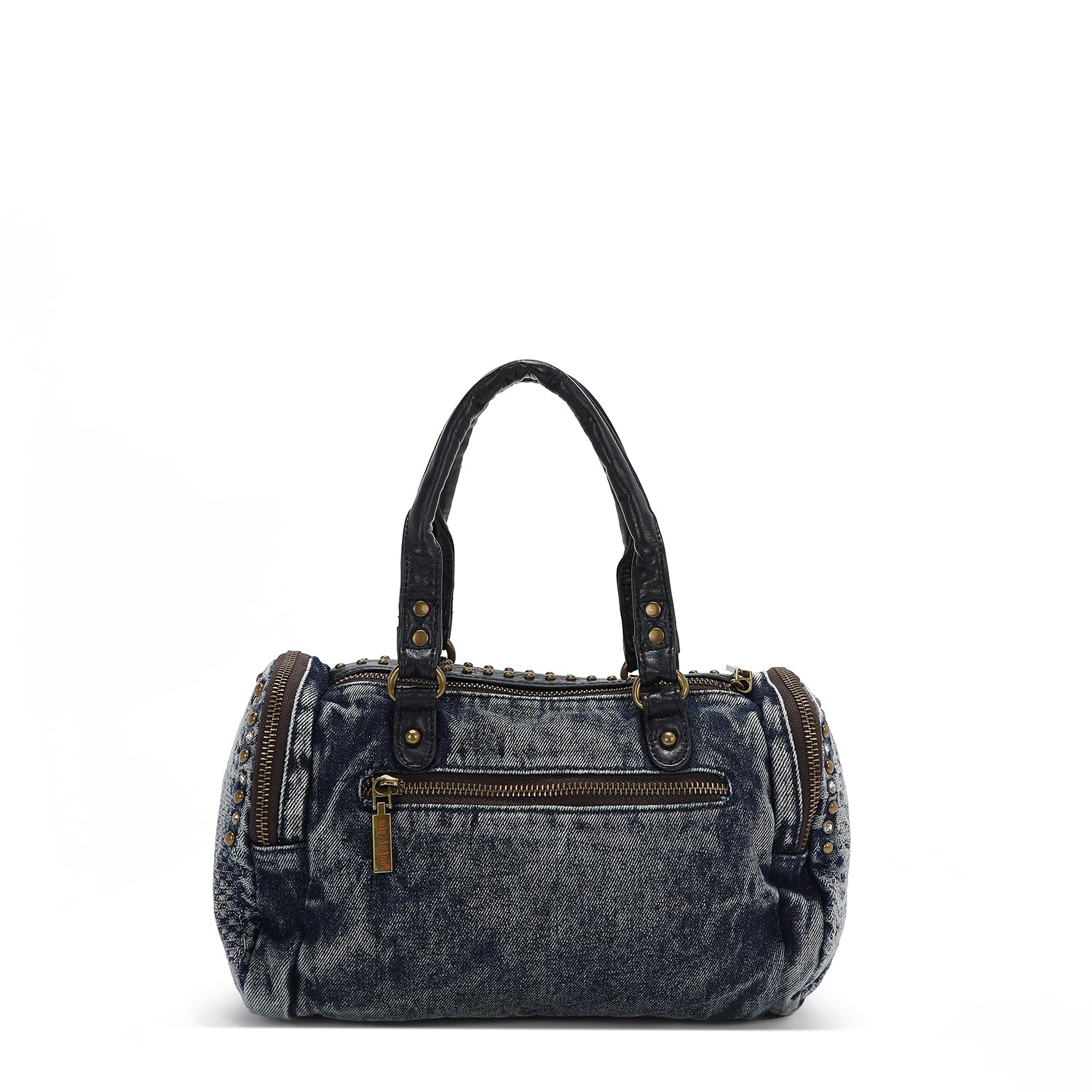Edgy and versatile, our washed denim mini handbag features a bold studded exterior and two spacious compartments for all your essentials. With convenient pockets on each side, this bag offers both style and practicality. Complete with a detachable shoulder strap, you can effortlessly switch between wearing it as a handbag, shoulder bag, or crossbody.