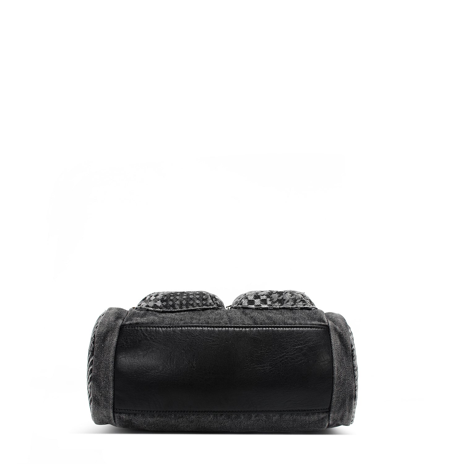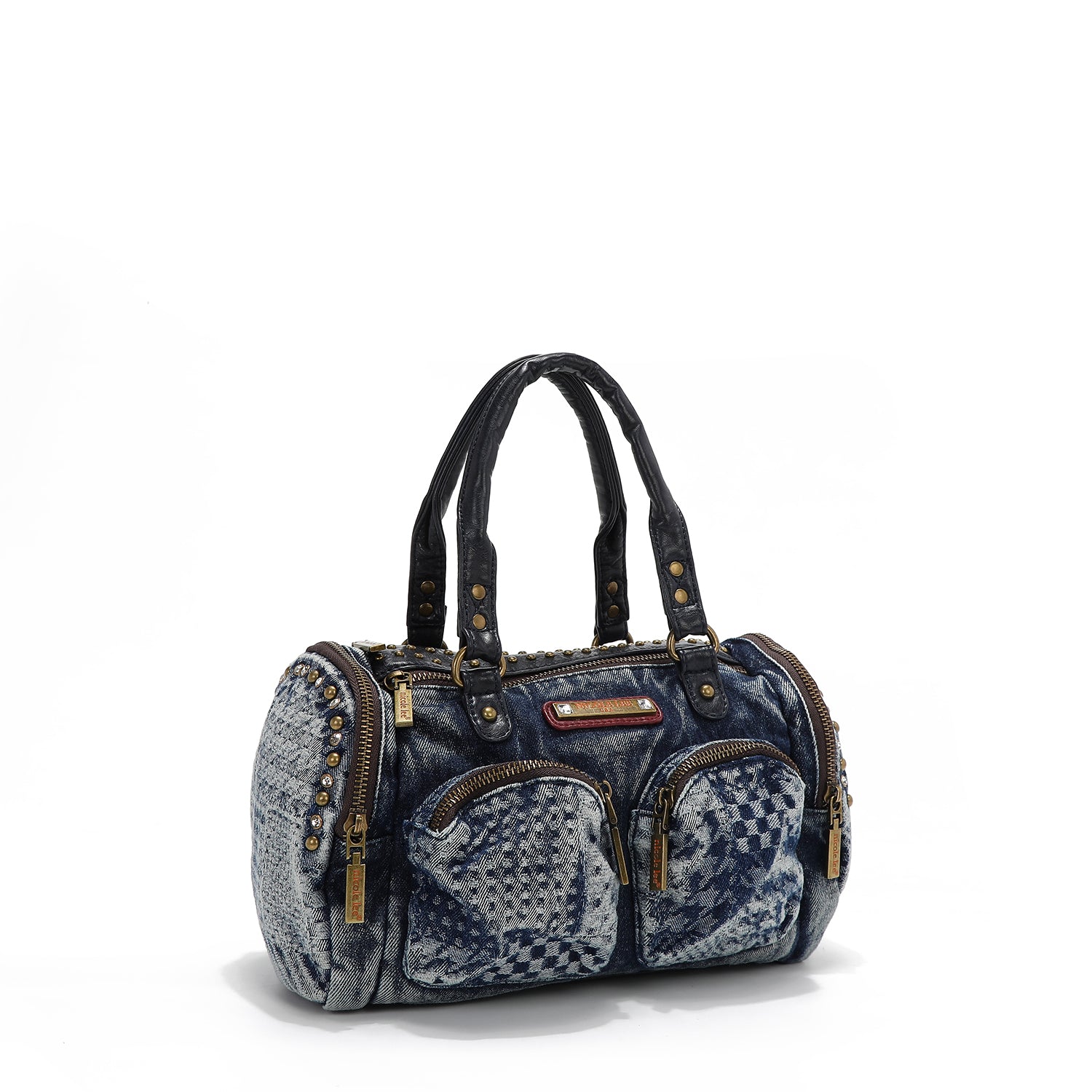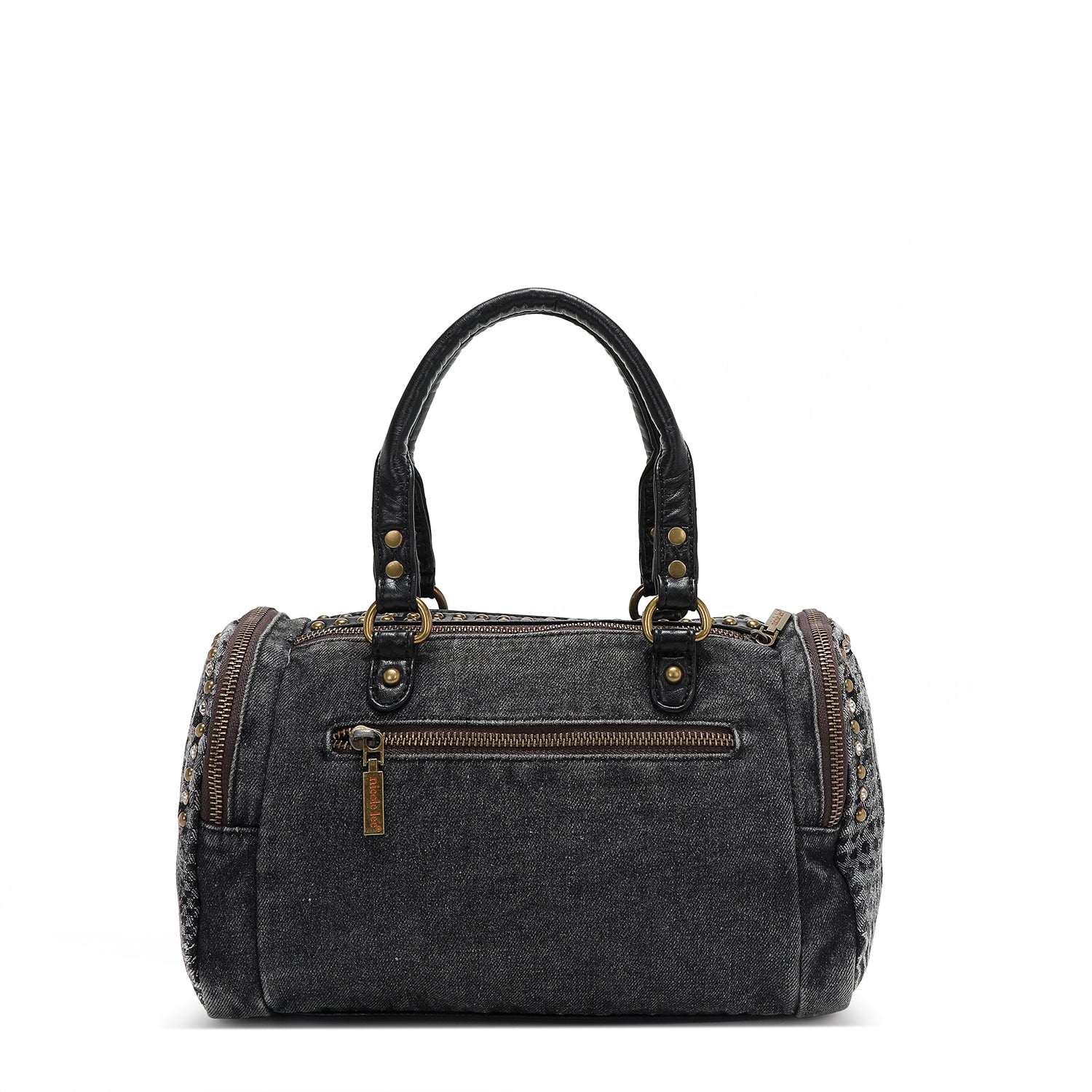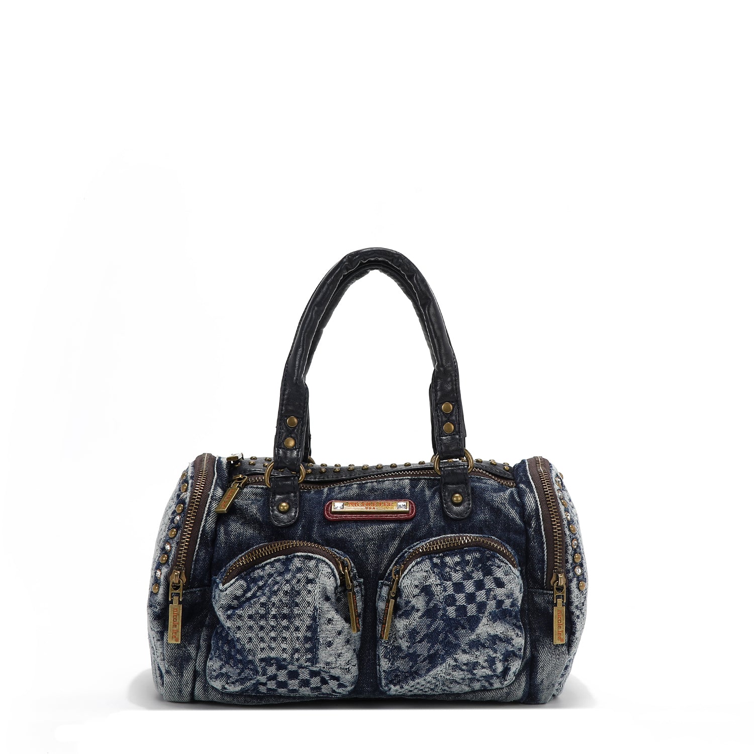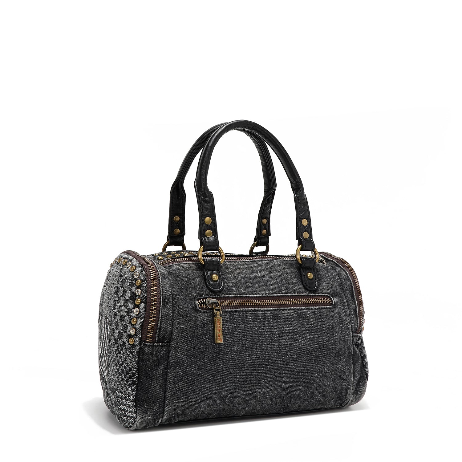Edgy and versatile, our washed denim mini handbag features a bold studded exterior and two spacious compartments for all your essentials. With convenient pockets on each side, this bag offers both style and practicality. Complete with a detachable shoulder strap, you can effortlessly switch between wearing it as a handbag, shoulder bag, or crossbody.