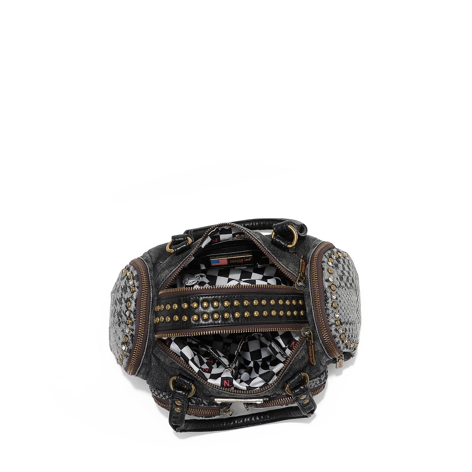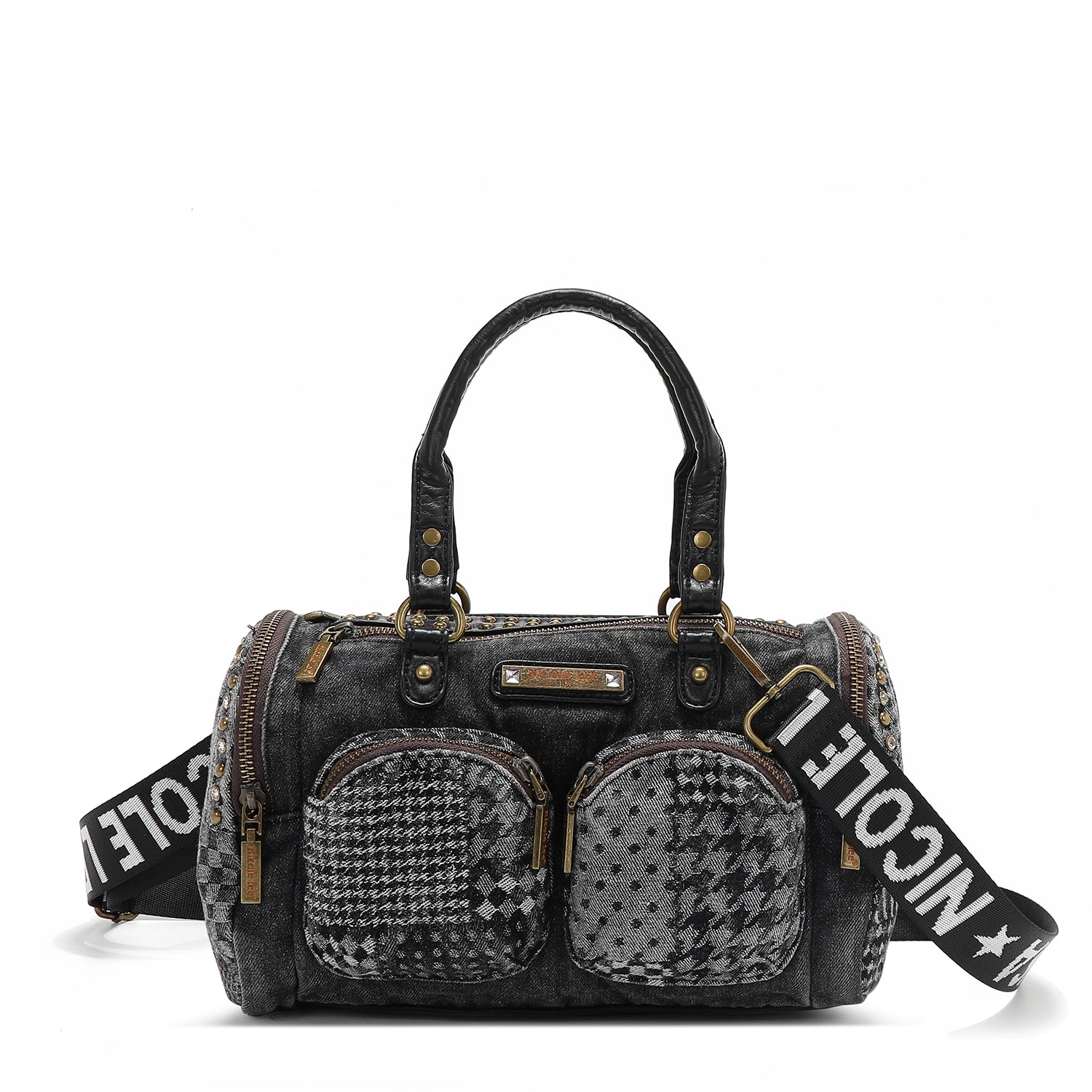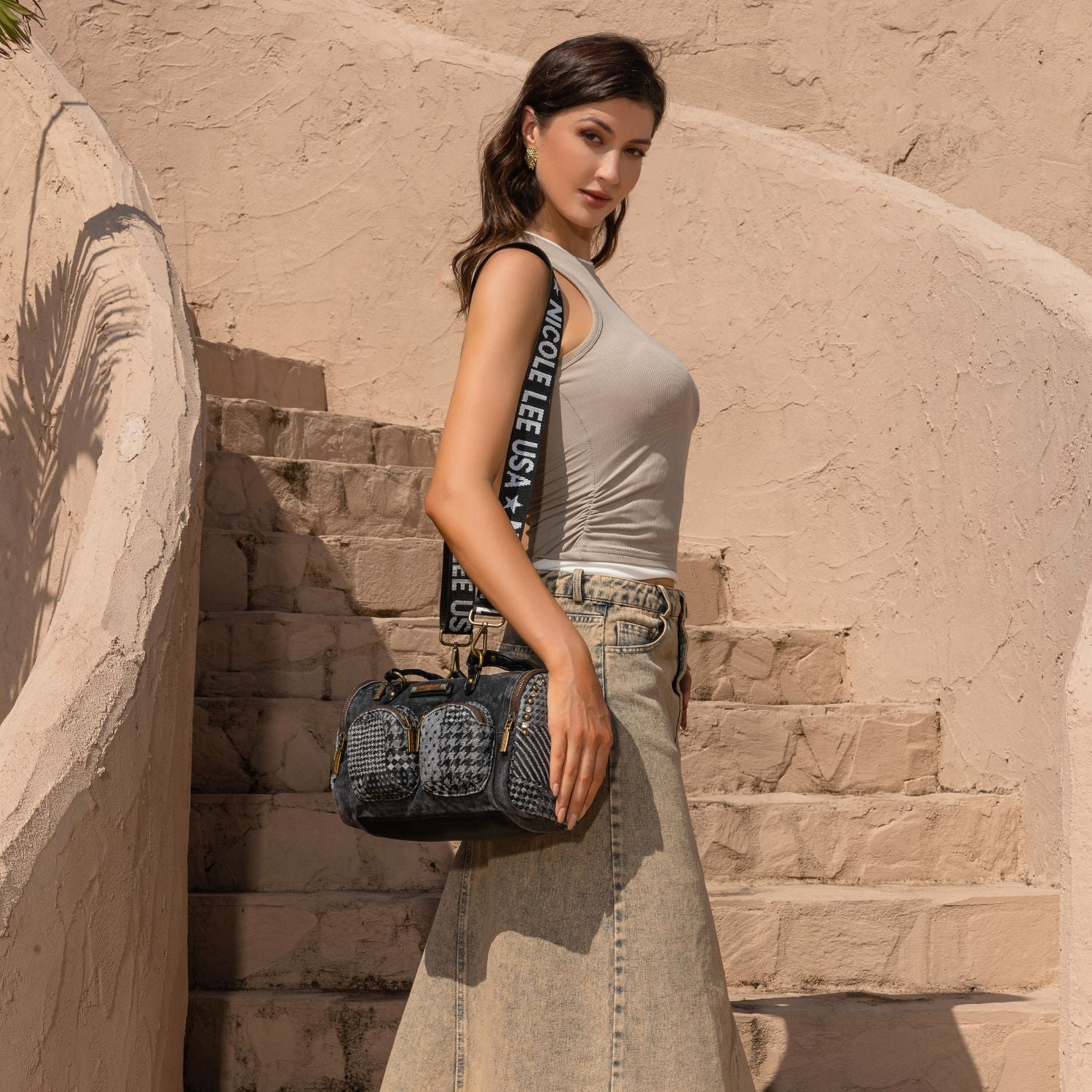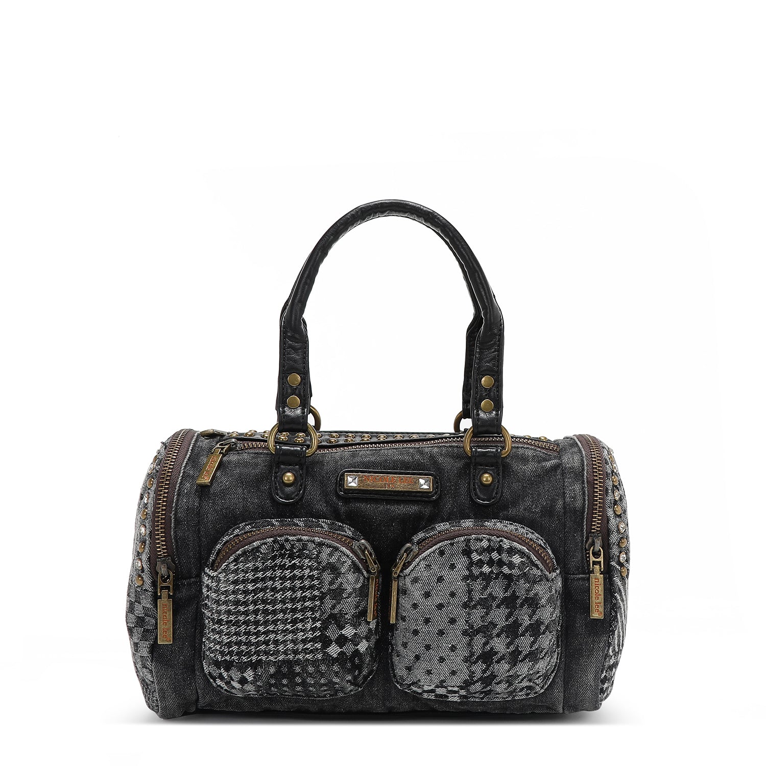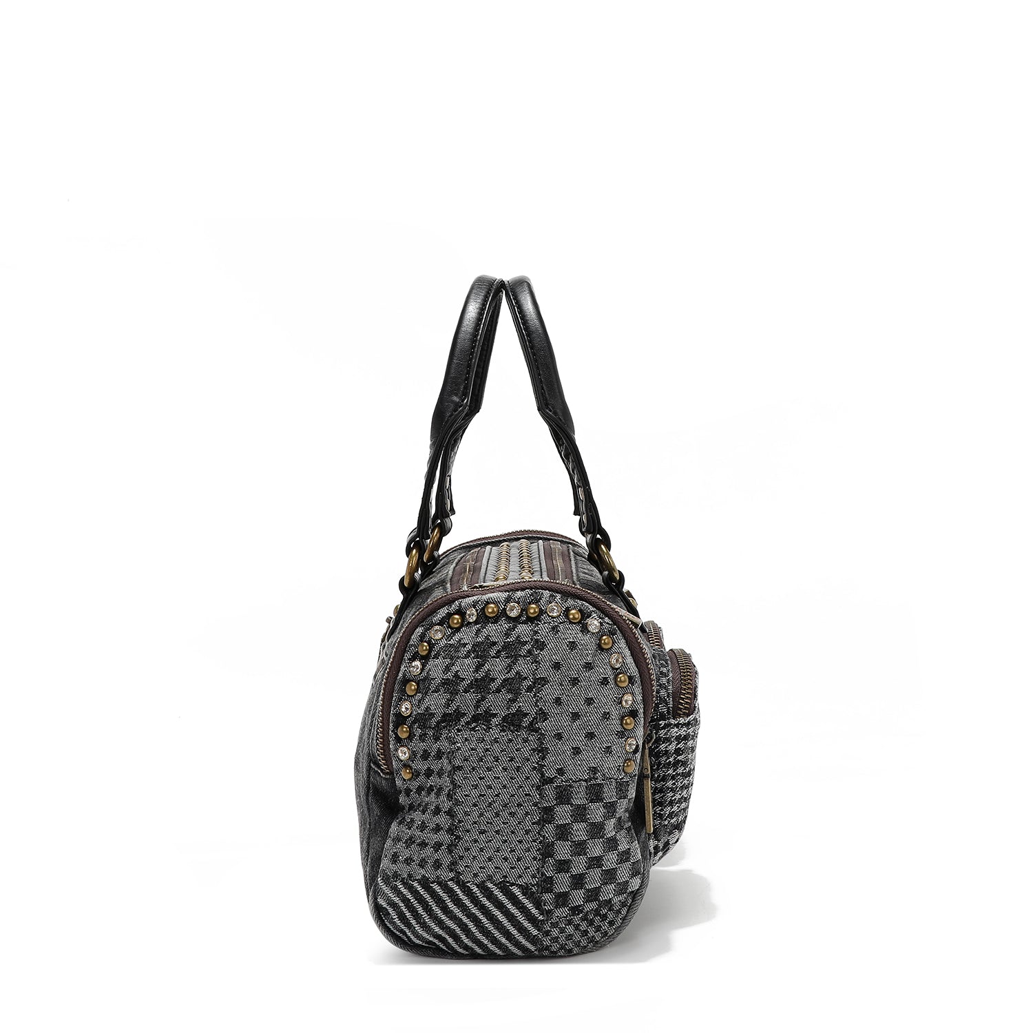 Edgy and versatile, our washed denim mini handbag features a bold studded exterior and two spacious compartments for all your essentials. With convenient pockets on each side, this bag offers both style and practicality. Complete with a detachable shoulder strap, you can effortlessly switch between wearing it as a handbag, shoulder bag, or crossbody.
